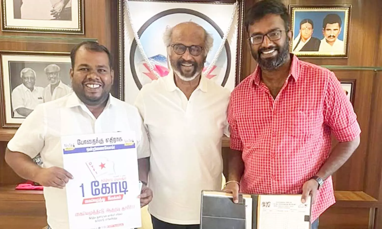 தமிழ்நாடு முழுவதும் இருக்கும் முக்கிய நபர்களைச் சந்தித்து கையெழுத்து பெற்று வருகிறார்கள். இன்று ரஜினிகாந்த் அந்த கையெழுத்து இயக்கத்தில் தன் கையெழுத்தைப் பதிவு செய்தார்.