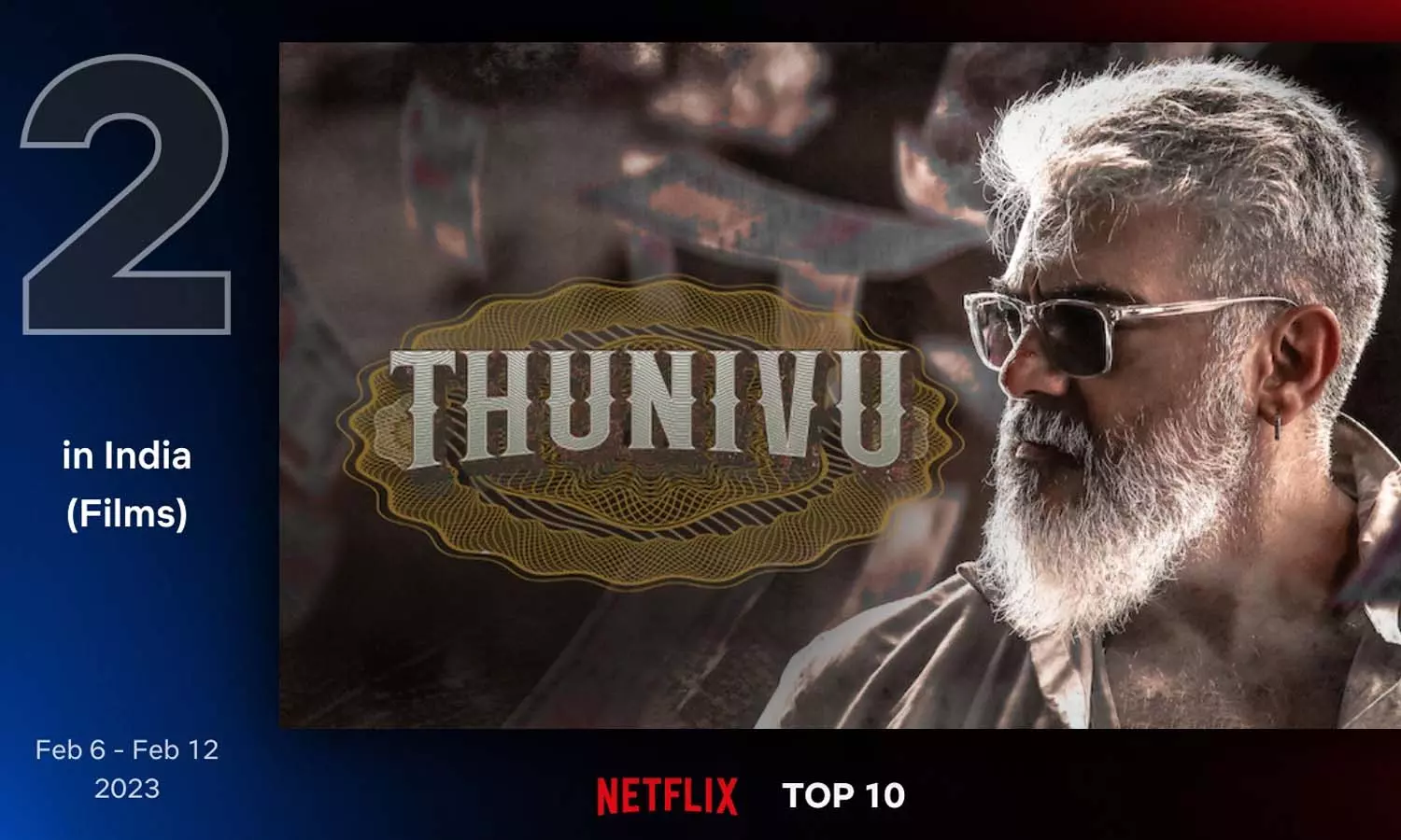 இந்நிலையில், நெட்ஃப்ளிக்ஸ் ஓடிடி தளம் வெளியிட்டுள்ள இந்தியாவின் டாப் 10 இடத்தில் இருக்கும் படங்கள் பட்டியலில் 'துணிவு' திரைப்படம் மூன்று இடங்களை பிடித்துள்ளது. அதாவது, 'துணிவு' திரைப்படத்தின் ஹிந்தி வெர்ஷன் முதலிடத்தையும் தமிழ் மற்றும் தெலுங்கு வெர்ஷன் இரண்டாவது மற்றும் நான்காவது இடத்தையும் பிடித்துள்ளது. இதனை ஓடிடி தளம் போஸ்டர் ஒன்றை வெளியிட்டு அறிவித்துள்ளது.