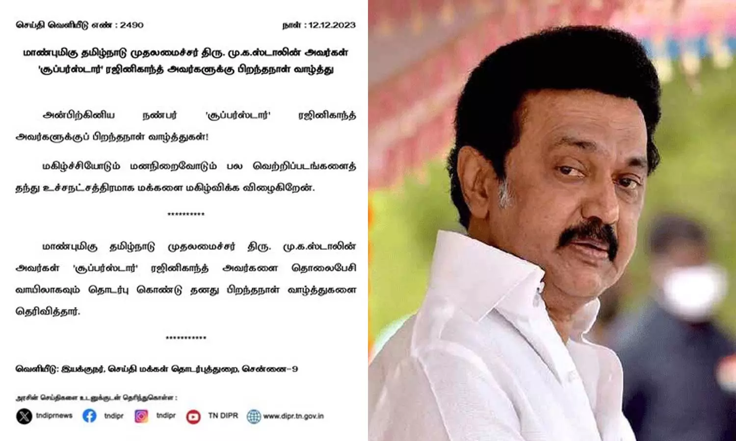 அந்த வகையில், தமிழக முதலமைச்சர் மு.க. ஸ்டாலின் நடிகர் ரஜினிகாந்த்-க்கு தொலைபேசியில் தொடர்பு கொண்டு பிறந்தநாள் வாழ்த்து தெரிவித்துள்ளார். இது தவிர, சமூக வலைதளலத்தில் அவர் வெளியிட்டுள்ள பதிவில், "அன்பிற்கினிய நண்பர் சூப்பர்ஸ்டார் ரஜினிகாந்த் அவர்களுக்கு பிறந்தநாள் வாழ்த்துகள்," என்று குறிப்பிட்டுள்ளார்.