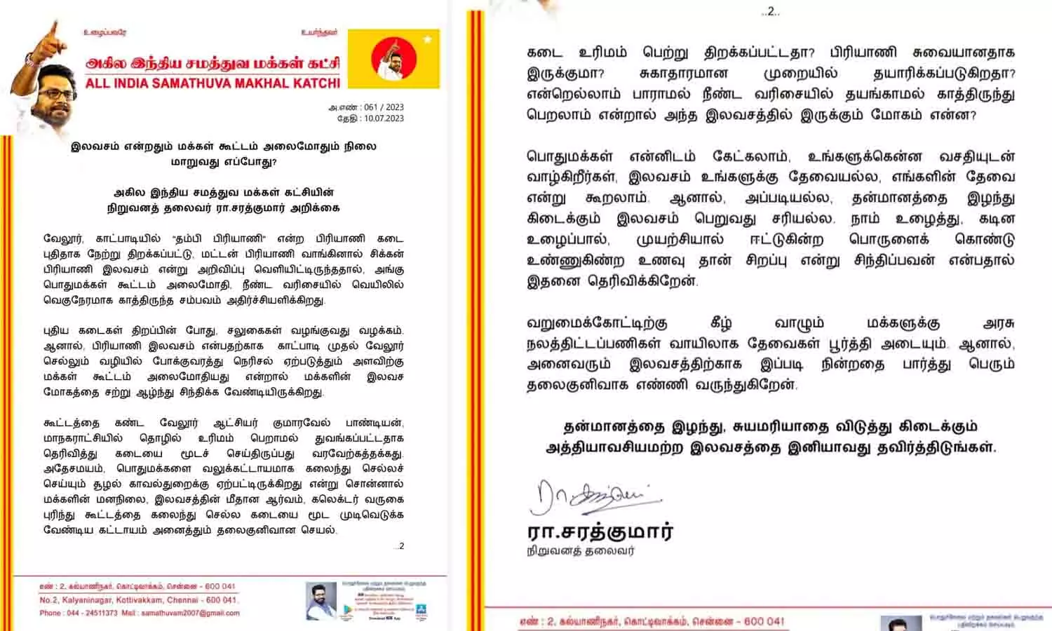 இந்நிலையில் இந்த சம்பவம் குறித்து நடிகரும், சமத்துவ மக்கள் கட்சி தலைவருமான சரத்குமார் சமூக வலைதளத்தில் அறிக்கை ஒன்றை வெளியிட்டுள்ளார். அதில், " வேலூர், காட்பாடியில் 'தம்பி பிரியாணி' என்ற பிரியாணி கடை புதிதாக திறக்கப்பட்டு மட்டன் பிரியாணி வாங்கினால் சிக்கன் பிரியாணி இலவசம் என்று அறிவிப்பு வெளியிட்டிருந்ததால், அங்கு பொதுமக்கள் கூட்டம் அலைமோதி, நீண்ட வரிசையில் வெயிலில் வெகுநேரமாக காத்திருந்த சம்பவம் அதிர்ச்சியளிக்கிறது.
