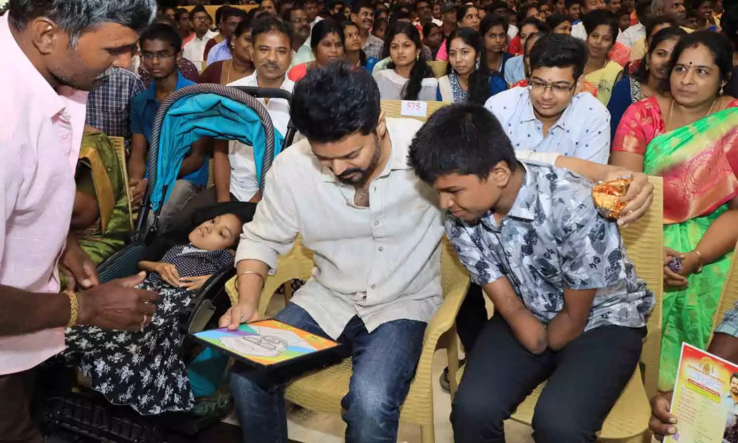 இந்த நிகழ்ச்சிக்காக தனது கட்அவுட்கள் எதுவும் வைக்கக்கூடாது என்று விஜய் தரப்பில் கூறப்பட்டிருப்பதால் சுவர் ஓவியங்கள் வரையும் பணியில் ரசிகர்கள் ஈடுப்பட்டிருந்தனர். இந்நிலையில், நடிகர் விஜய் தனது இல்லத்திலிருந்து நீலாங்கரை மண்டபத்திற்கு காரில் சென்றார். இவருடன் ரசிகர்கள் தங்களது இரு சக்கர வாகனங்களில் பின் தொடர்ந்து சென்றனர்.பின் அவர் நீலாங்கரை தனியார் அரங்கத்திற்கு சென்றார். அங்கு விஜய்க்கு மாற்றுத் திறனாளி மாணவர் ஒருவர் பரிசு வழங்கினார்.