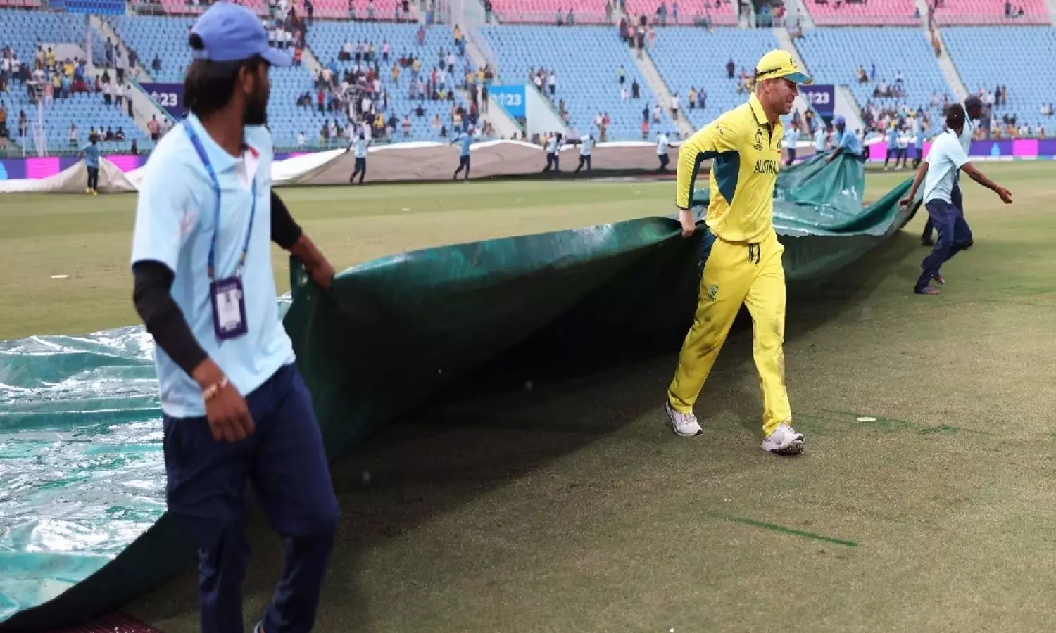 இலங்கை 32 ஓவரில் 4 விக்கெட்டுகளை இழந்து 177 ரன்கள் எடுத்திருந்தது. அப்போது மழை குறுக்கிட்டது. மழை நீர் மைதானத்தில் படாமல் இருக்க ஊழியர்கள் பெரிய கவரை எடுத்து வந்தனர். அப்போது அவர்களுக்கு உதவியாக ஆஸ்திரேலிய அணியின் தொடக்க ஆட்டக்காரர் டேவிட் வார்னர் அவர்களுடன் சேர்ந்து அந்த கவரை எடுக்க உதவினார்.