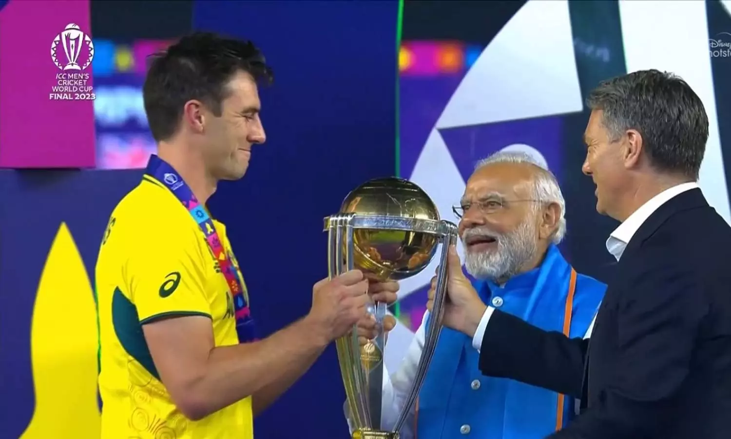 பின்னர் இந்தியா பிரதமர் மோடி, ஆஸ்திரேலிய துணை பிரதமர் ஆகியோர் இணைந்து பேட் கம்மின்ஸிடம் கோப்பையை வழங்கினர். பின்னர், ஆஸ்திரேலிய வீரர்கள் மகிழ்ச்சியில் திளைத்தனர்.