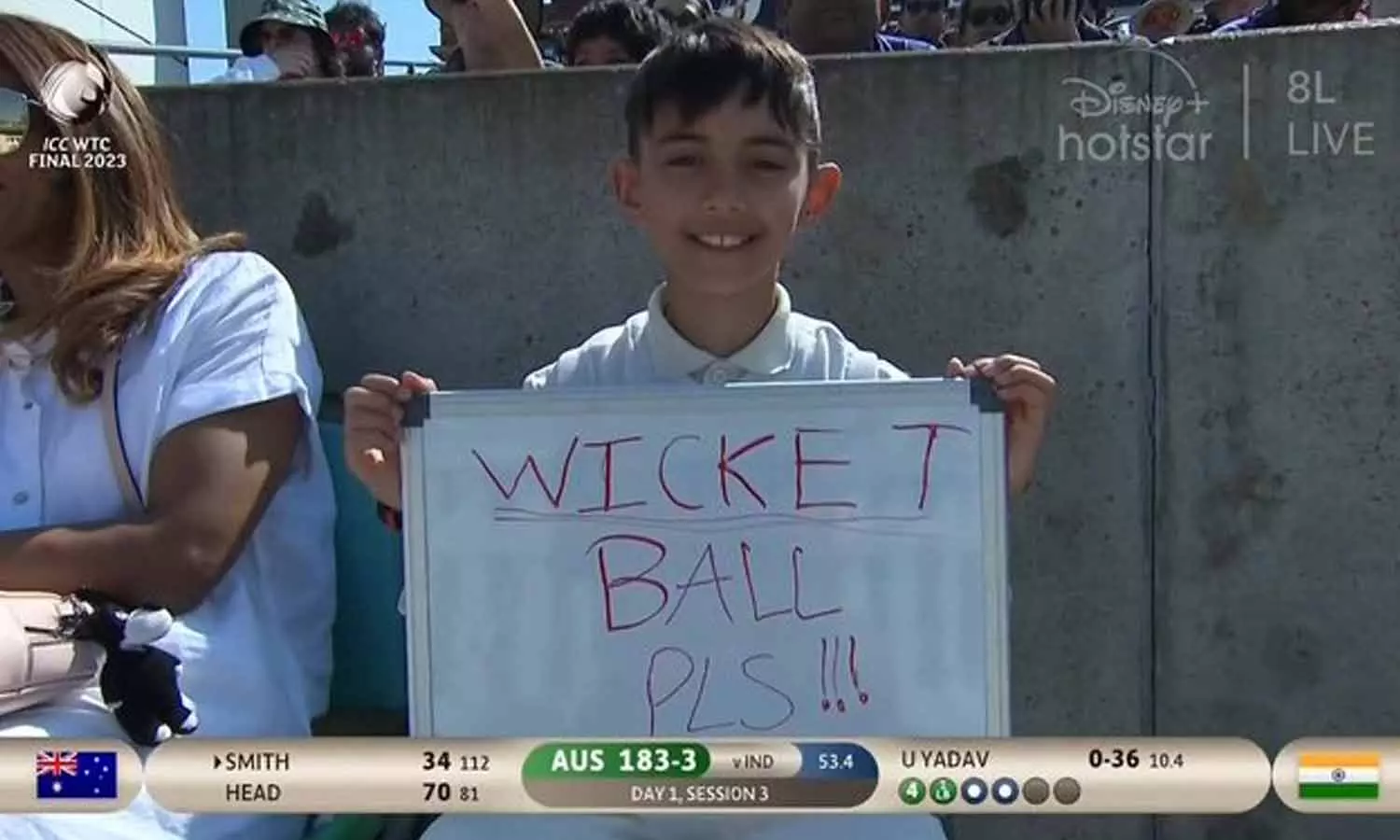 ஆஸ்திரேலிய அணி 76 ரன்களுக்கு 3-வது விக்கெட் இழந்த நிலையில் ஸ்மித் - டிராவிஷ் ஹெட் ஜோடி சிறப்பான பார்டன்ஷிப்பை அமைத்து விளையாடி வருகின்றனர். இந்நிலையில் விக்கெட் பந்து வீச சொல்லி ஒரு சிறுவன் பலகையை ஏந்தி நின்றான். இந்த புகைப்படம் இணையதளத்தில் வைரலாகி வருகிறது.