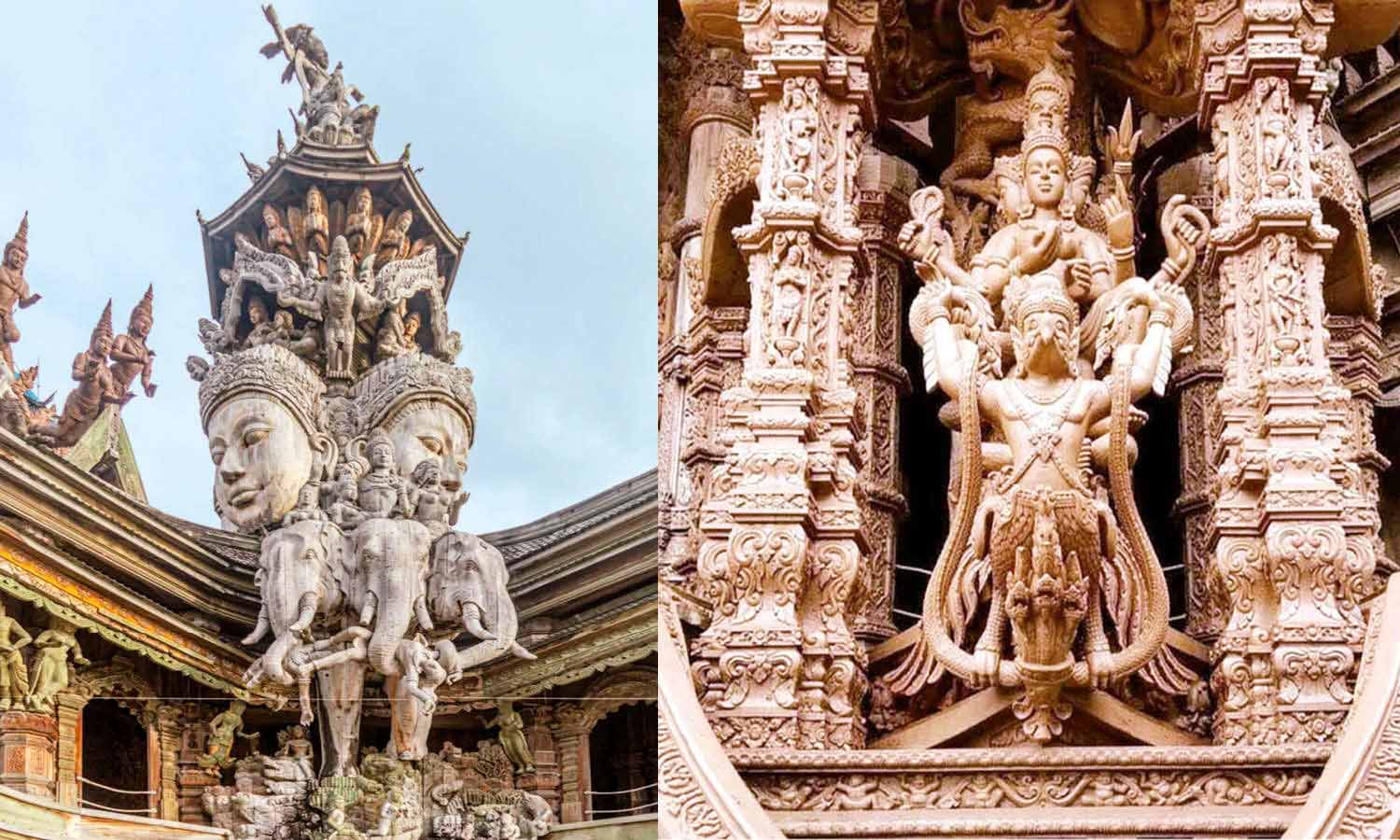 இந்த ஆலயத்திற்குள் அயோத்தியை ஆட்சி செய்த ராமரின் வாழ்க்கை வரலாறு, புத்த மதத்தின் வரலாறு, இந்து மதத்தில் உள்ள பல்வேறு புராணங்களைக் கூறும் சிற்பங்கள் அனைத்தும் மரத்திலேயே வடிவமைக்கப்பட்டிருக்கின்றன. மைடீயாங், மைடாக்கியன், மாய் பஞ்சட் மற்றும் தேக்கு போன்ற மரங்களால் இந்த சத்தியத்தின் சரணாலயம் எழுப்பட்டிருக்கிறது. இந்த ஆலயத்தின் சிறப்பு என்னவென்றால், ஒரு மரக்கட்டைக்கும், இன்னொரு மரக்கட்டைக்குமான இணைப்பாக கூட, எந்த இரும்பு பொருட்களும் பயன்படுத்தப்படவில்லை. இணைப்பிற்கும் கூட மரத்தால் ஆன 'ஆப்பு' கொண்டே வடிவமைக்கப்பட்டிருக்கிறது.