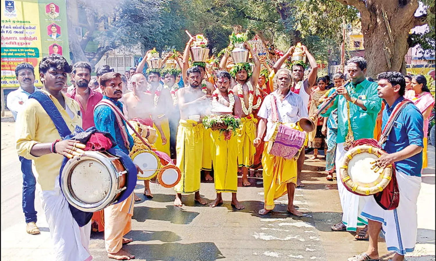 இதை முன்னிட்டு நேற்று சட்டநாதபுரம் உப்பனாற்று கரையிலிருந்து பால்குடம், அலகு காவடி ஆகியவற்றை பக்தர்கள் ஊர்வலமாக முக்கிய வீதிகள் வழியாக எடுத்து வந்து கோவிலை அடைந்தனர்.