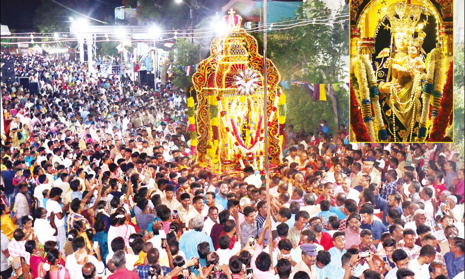 பல்லாயிரக்கணக்கான மக்கள் மத்தியில் அன்னையின் சப்பரம் பவனி வந்த காட்சி. (உள்படம்: பனிமய மாதா)