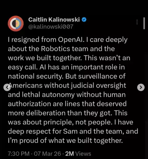 இந்நிலையில் பென்டகனுடன் செய்துகொண்ட ஒப்பந்தத்திற்கு எதிர்ப்பு தெரிவித்து ஓபன் ஏஐ நிறுவனத்தின் ரோபோடிக்ஸ் பிரிவு தலைவரான கைட்லின் கலினோவ்ஸ்கி தனது பதவியை ராஜினாமா செய்துள்ளார்.