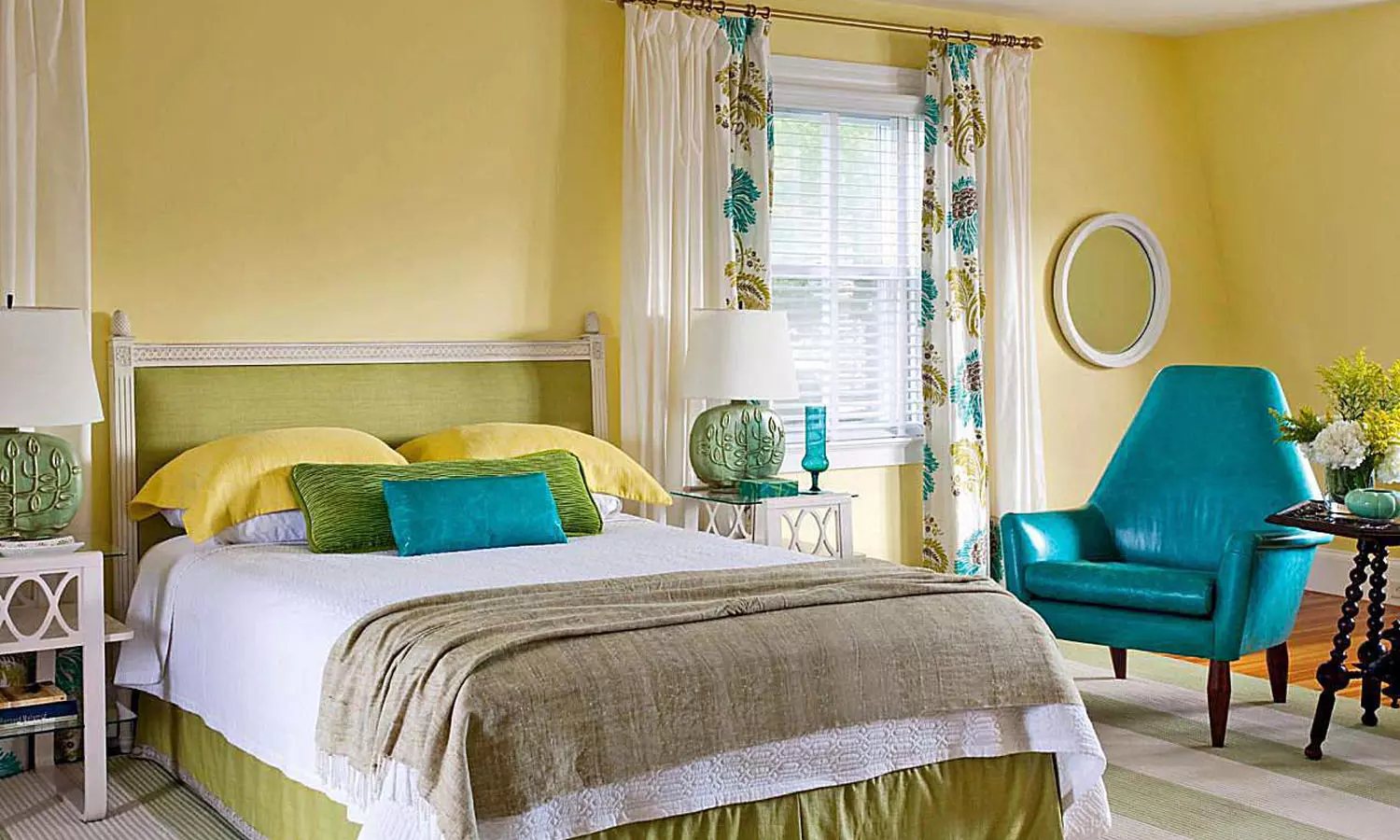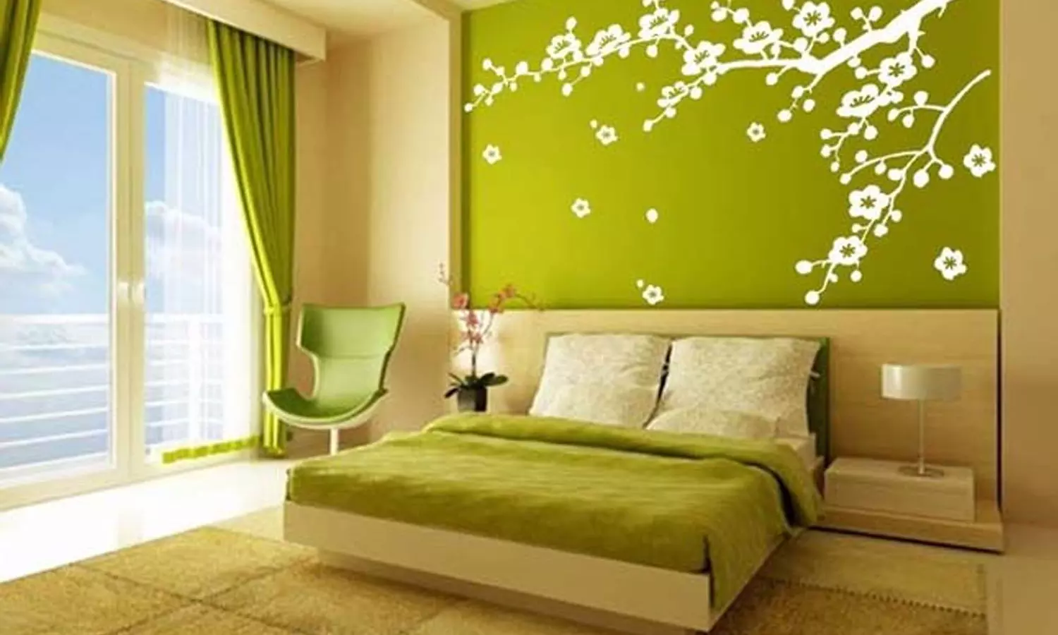 அறைகளில் இருக்கும் எல்லாவித பொருட்களோடும் பொருந்தக்கூடிய நிறங்களில் இது முதலிடத்தில் உள்ளது. மன அமைதி, மன நிறைவு ஆகியவைகளை இளம் பச்சை நிறம் தூண்டுவதாக இருக்கிறது. வயது முதிர்ந்தவர்கள் மற்றும் இளைய வயதினர் படுக்கையறைகளில் இந்த வண்ணத்தை அதிகமாக பயன்படுத்தலாம். பர்னிச்சர்களும் இளம் பச்சை நிறத்தில் இருக்கும் பட்சத்தில் அறை முழுவதும் குளிர்ச்சியான தோற்றத்துடன் இருக்கும். மனதின் அழுத்தத்தை குறைப்பதில் கத்திரிப்பூ மற்றும் அதன் சாயல் கொண்ட நிறங்கள் குறிப்பிட்ட பங்கு வகிக்கின்றன. முக்கியமாக தரை விரிப்புகளில் இதன் சாயல் கொண்ட நிறம் இருப்பது சிறப்பாக இருக்கும்.