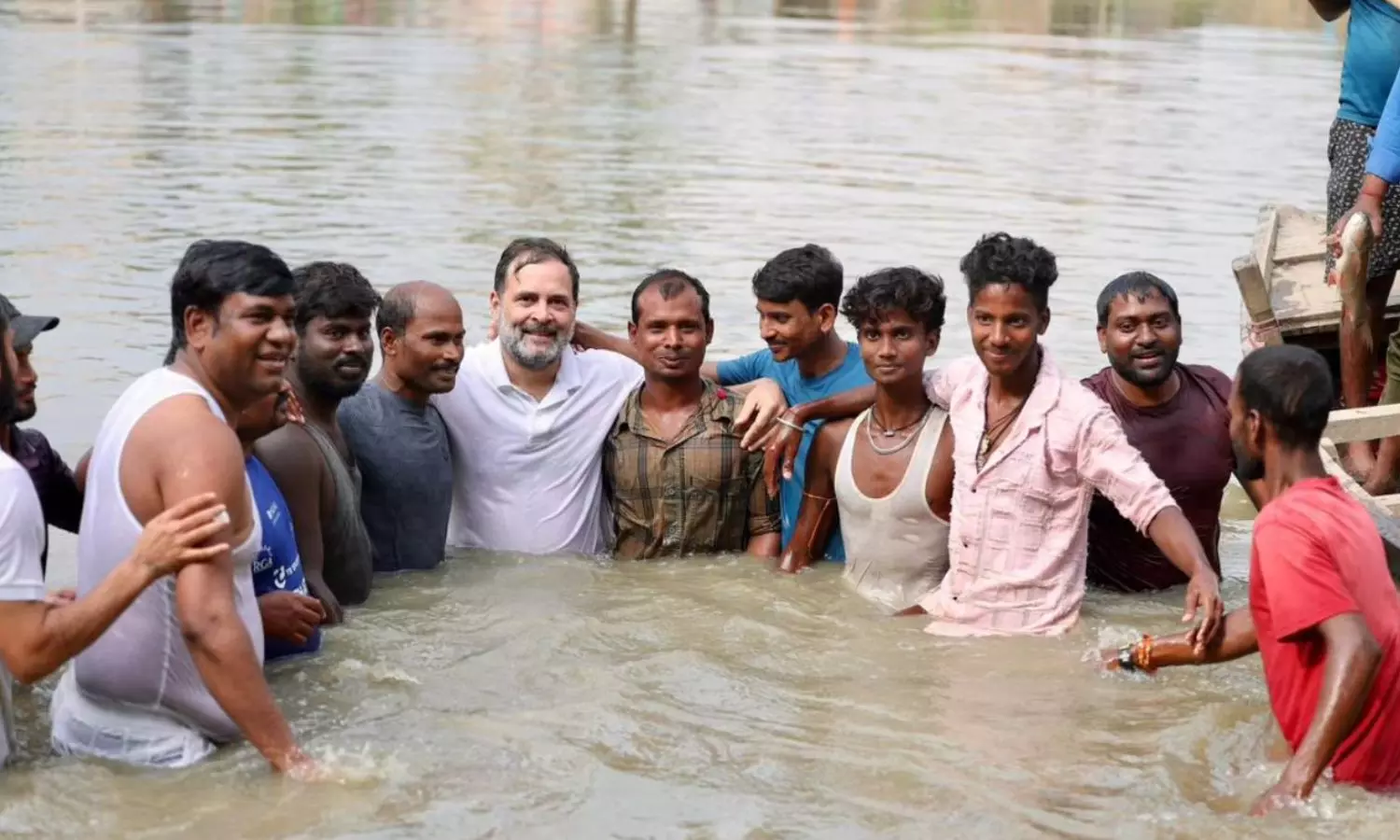 பீகார் மாநிலம் பேகுசராய் பகுதியில் தனது வழக்கமான வெள்ளை டீ-சர்ட் மற்றும் கருப்பு பேன்ட்டுடன், ராகுல் காந்தி ஏரியில் இறங்கி நீச்சல் அடித்தார்.