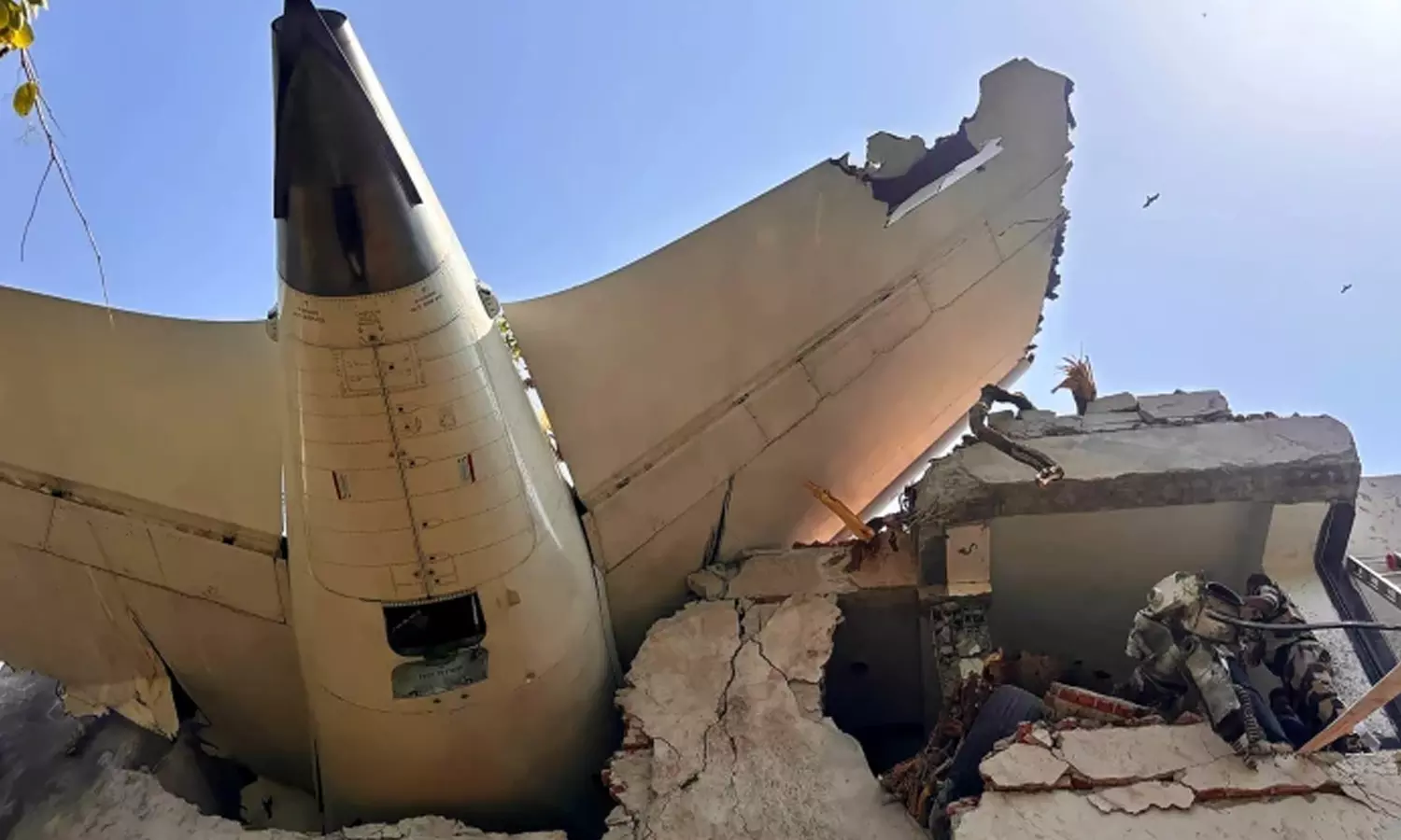 ரன்வேயில் இருந்து வானில் பறந்த விமானம் திடீரென கீழே இறங்கி, விமான நிலையத்தின் அருகில் உள்ள பி.ஜே. மருத்துவக் கல்லூரி விடுதி கட்டிடத்தில் மோதி தீப்பிடித்தது.