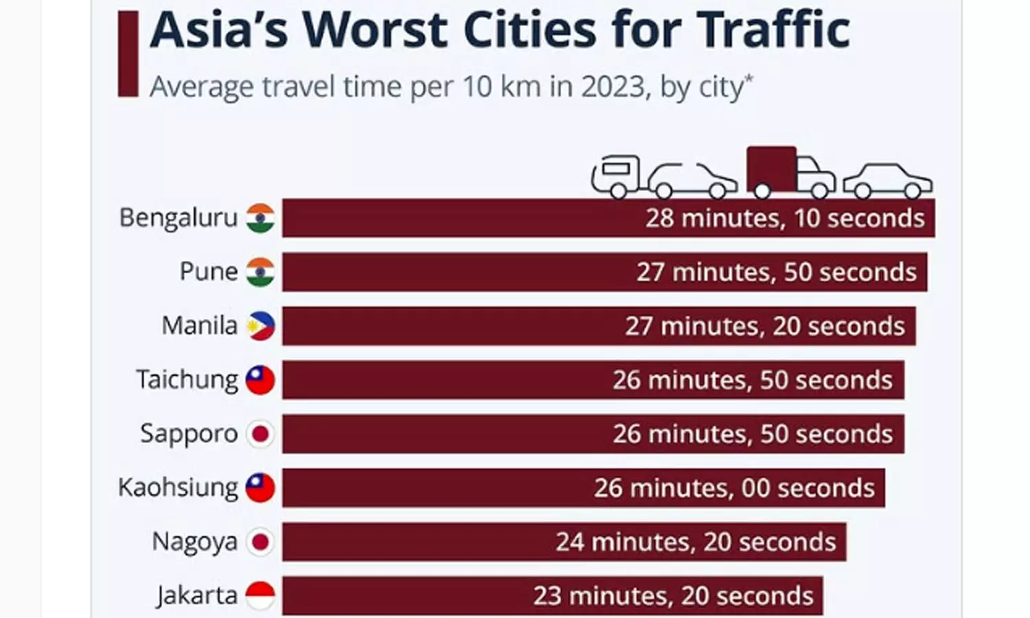 ஆசியாவில் போக்குவரத்தில் மோசமான நகரம் என்ற பெயரை கர்நாடக மாநிலத்தின் தலைவரம் பெங்களூரு பெற்றுள்ளது. இங்கு 10 கிலோ மீட்டர் தூரத்தை கடக்க சராசரியாக 28 நிமிடங்கள் 10 நொடிகள் ஆவது ஆய்வில் தெரியவந்துள்ளது.