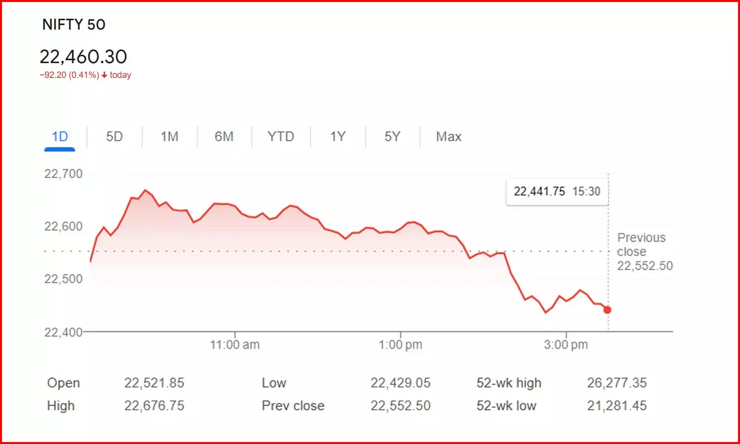 இன்று காலை 22,521.85 புள்ளிகளில் வர்த்தகம் தொடங்கியது. இன்று குறைந்தபட்சமாக நிஃப்டி 22,429.05 புள்ளிகளிலும், அதிகபட்சமாக நிஃப்டி 22,675.75 புள்ளிகளிலும் வர்த்தகமானது. இறுதியாக 92.20 புள்ளிகள் சரிந்து 22,460.30 புள்ளிகளில் வர்த்தகம் நிறைவடைந்தது.