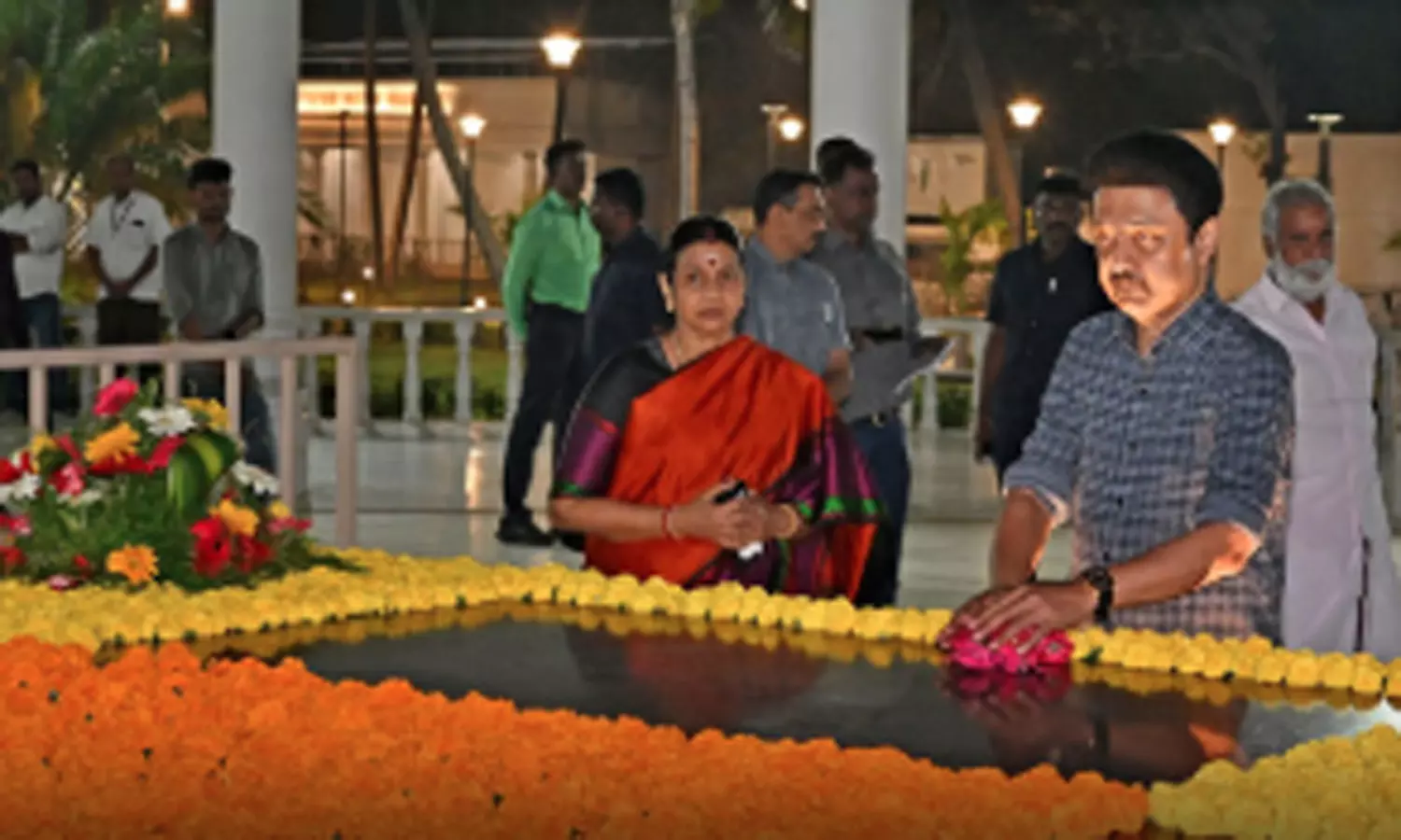 ஆங்கில புத்தாண்டையொட்டி மெரினா கடற்கரையில் உள்ள கலைஞர் கருணாநிதி, அண்ணா நினைவிடங்களில் முதலமைச்சர் மு.க.ஸ்டாலின், அவரது மனைவி துர்கா ஸ்டாலின் நேற்று இரவு மரியாதை செலுத்தினர்.