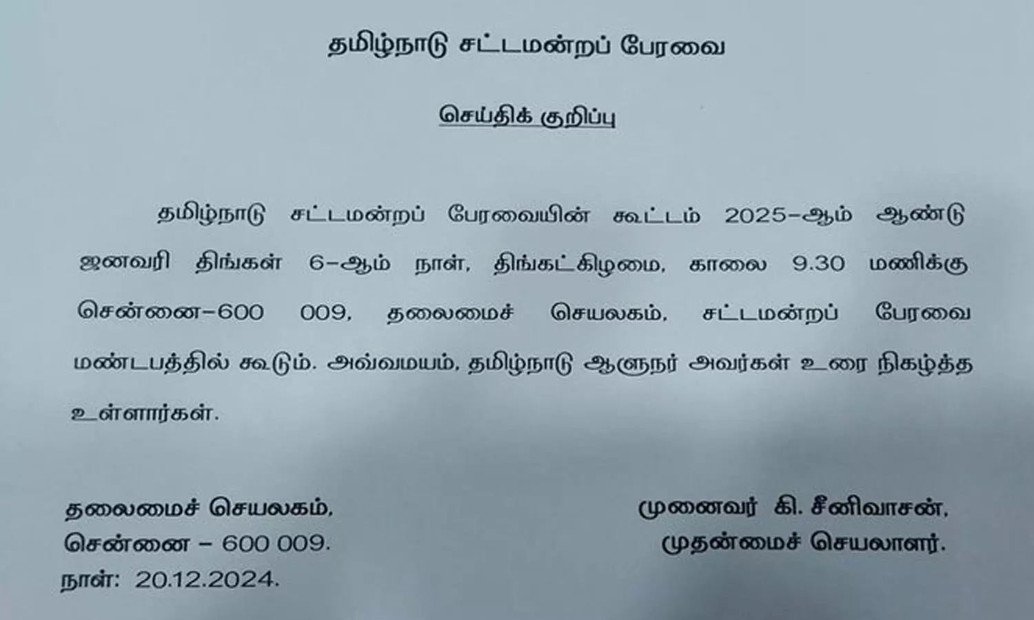 இதைத் தொடர்ந்து 2025-ம் ஆண்டுக்கான சட்டமன்ற கூட்டத்தொடர் ஜனவரி 6-ந்தேதி கூட்டப்பட உள்ளது.