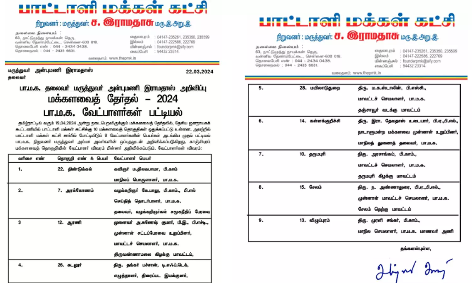 - திண்டுக்கல் தொகுதியில் திலகபாமா,மயிலாடுதுறை தொகுதியில் ம.க.ஸ்டாலின், கடலூர் தொகுதியில் தங்கர் பச்சான் போட்டியிடுகின்றனர்.