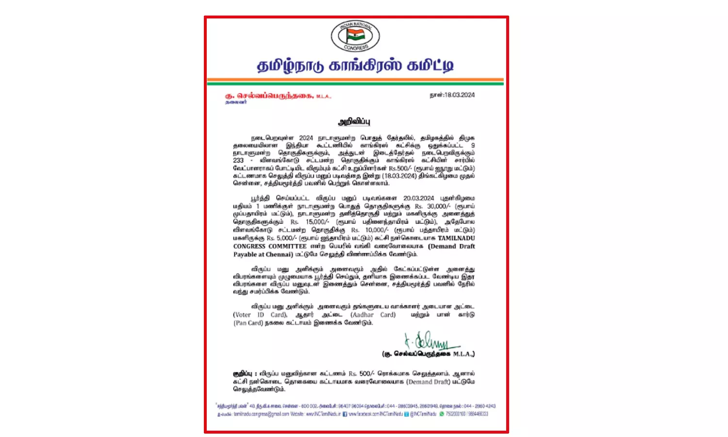 பாராளுமன்ற தேர்தலில், தமிழகத்தில் திமுக தலைமையிலான இந்தியா கூட்டணியில் காங்கிரஸ் கட்சிக்கு ஒதுக்கப்பட்ட 9 பாராளுமன்ற தொகுதிகளுக்கும், அத்துடன் இடைத்தேர்தல் நடைபெறவிருக்கும் 233 விளவங்கோடு சட்டமன்ற தொகுதிக்கும் காங்கிரஸ் கட்சியின் சார்பில் வேட்பாளராகப் போட்டியிட விரும்பும் கட்சி உறுப்பினர்கள் ரூ.500 கட்டணமாக செலுத்தி விருப்ப மனுப்படிவத்தை இன்று முதல் சென்னை, சத்தியமூர்த்தி பவனில் பெற்றுக் கொள்ளலாம்.