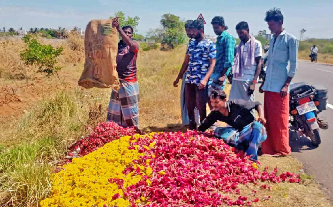 ஒரு கிலோ ரூ. 10-க்கும் கீழ் குறைந்ததால் சாலையில் பூக்களை கொட்டிய விவசாயிகள்-விளைச்சல் இருந்தும் விலை இல்லாததால் வேதனை