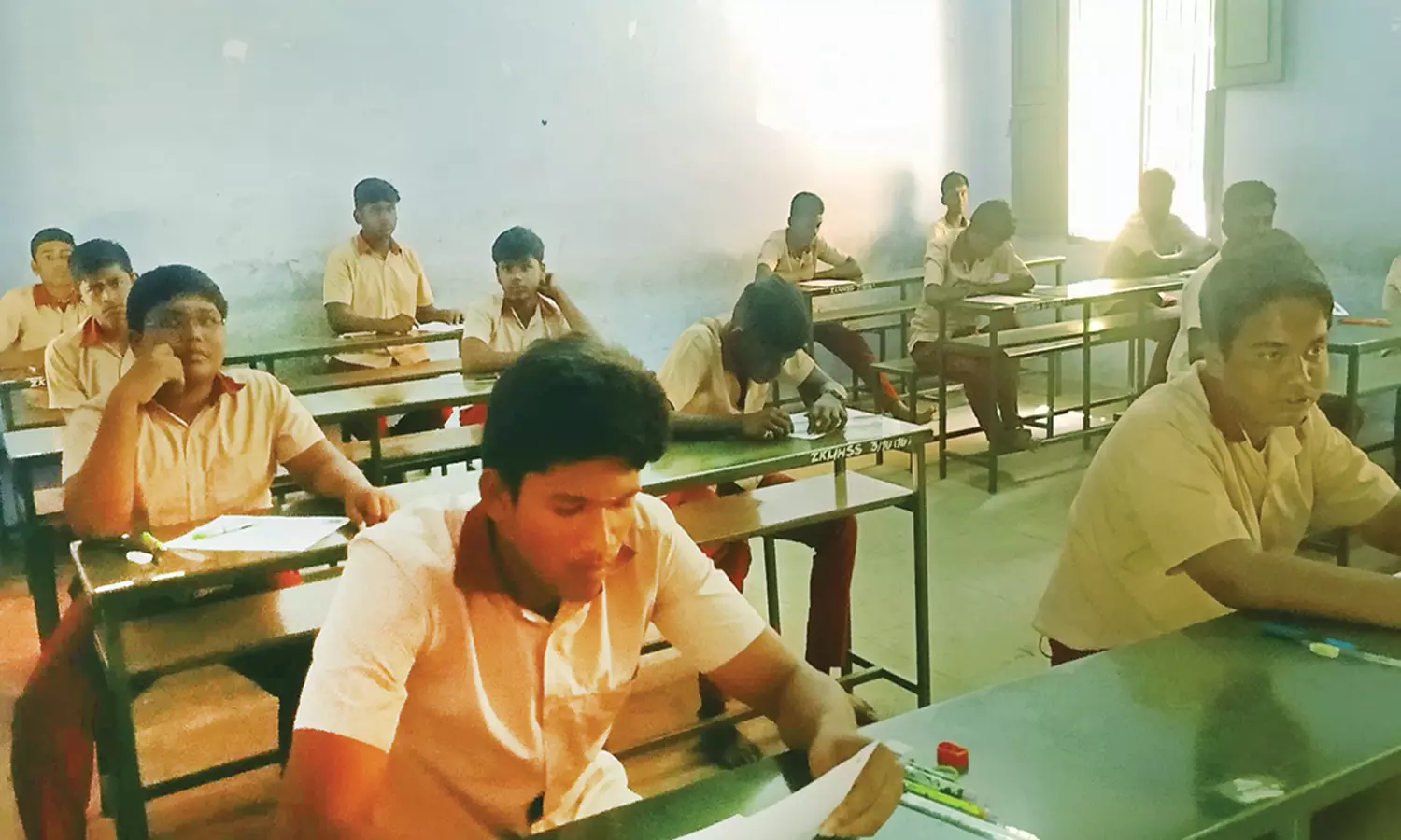 போடியில் 10-ம் வகுப்பு அரசு பொதுத்தேர்வு எழுதும் மாணவர்கள்.
