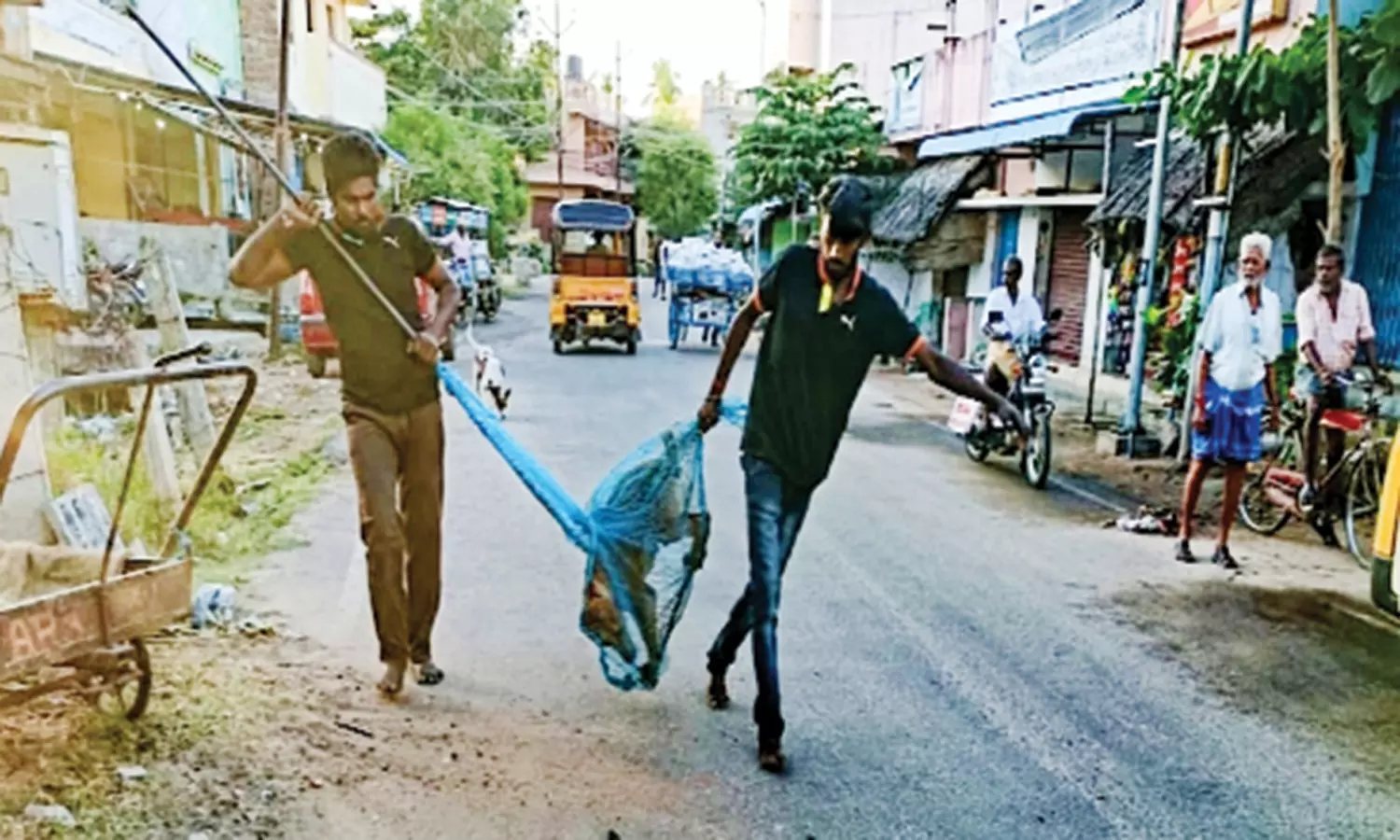 தெருநாய்களை பிடிக்கும் பணியில் ஈடுபட்டுள்ள நகராட்சி பணியாளர்கள்.