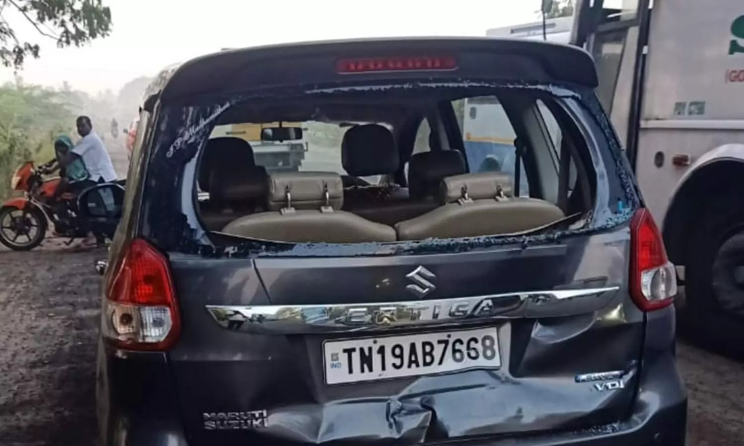 இ.சி.ஆரில் கார் மீது அரசு பேருந்து மோதல் - அதிர்ஷ்டவசமாக 3 பேர் உயிர் தப்பினர்