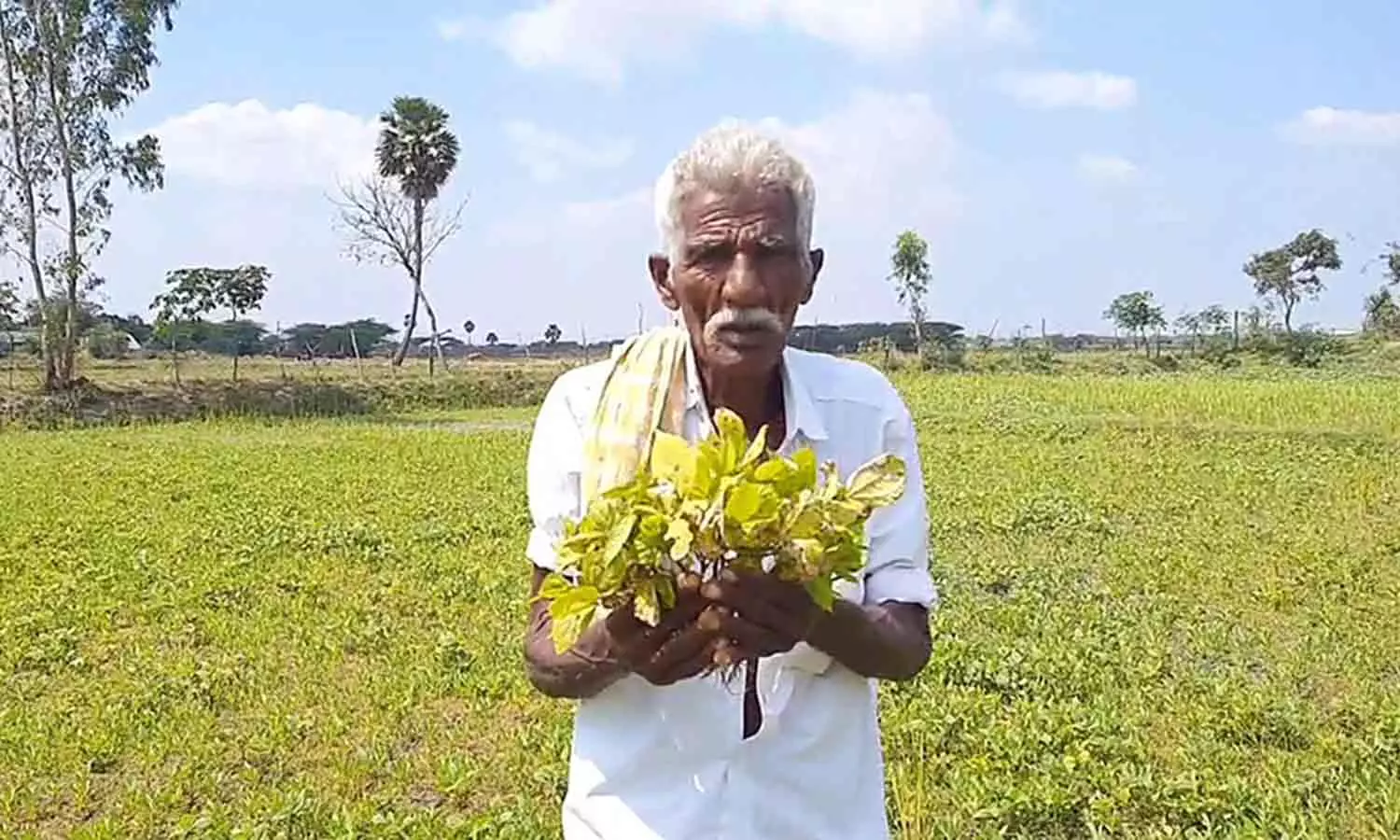 சேதமான உளுந்து பயிருடன் விவசாயி.