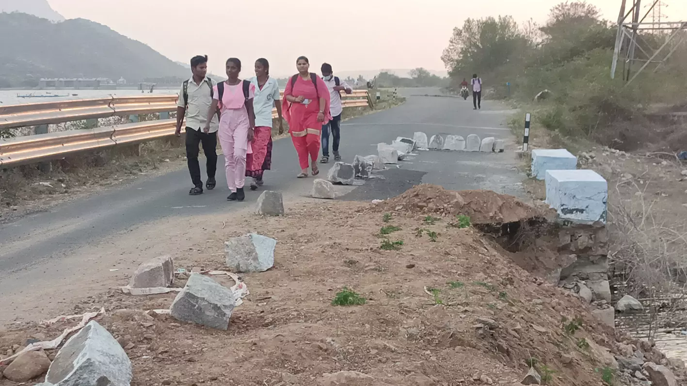 உடைந்த சாலையை கடந்து செல்லும் பள்ளி, கல்லூரி மாணவர்களை படத்தில் காணலாம்.