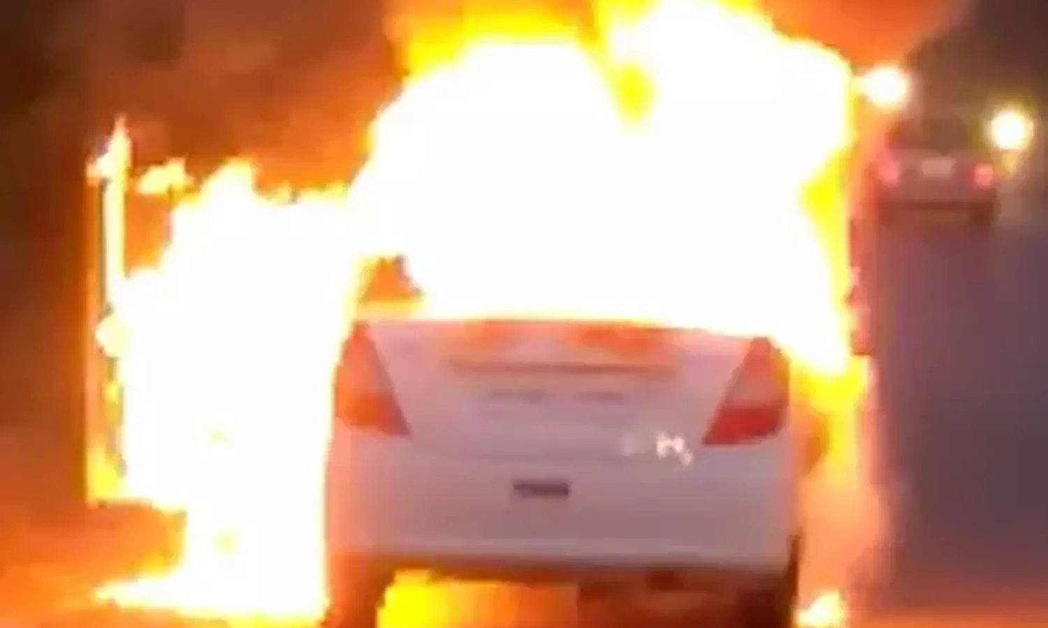 உடனடியாக அங்கு இருந்தவர் தீ பிடித்த காரை கிரேன் மூலமாக அங்கு இருந்து அகற்றினர். சற்று நேரத்தில் தீயணைப்பு வீரர்கள் சம்பவஇடத்துக்கு விரைந்து வந்தனர்.