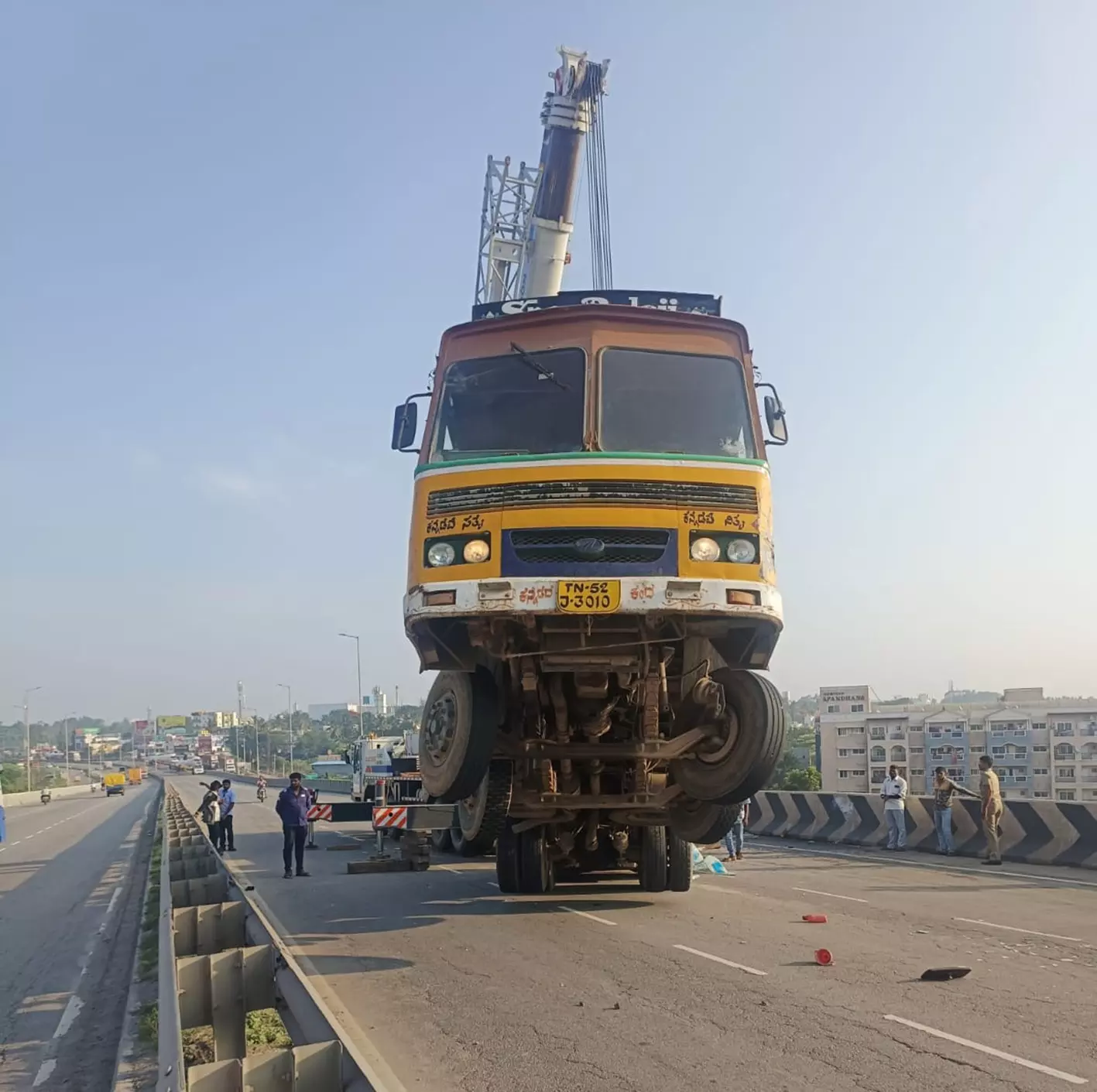 விபத்துக்குள்ளான லாரி, கிரேன் மூலம் அப்புறப்படுத்தியபோது எடுத்த படம்.