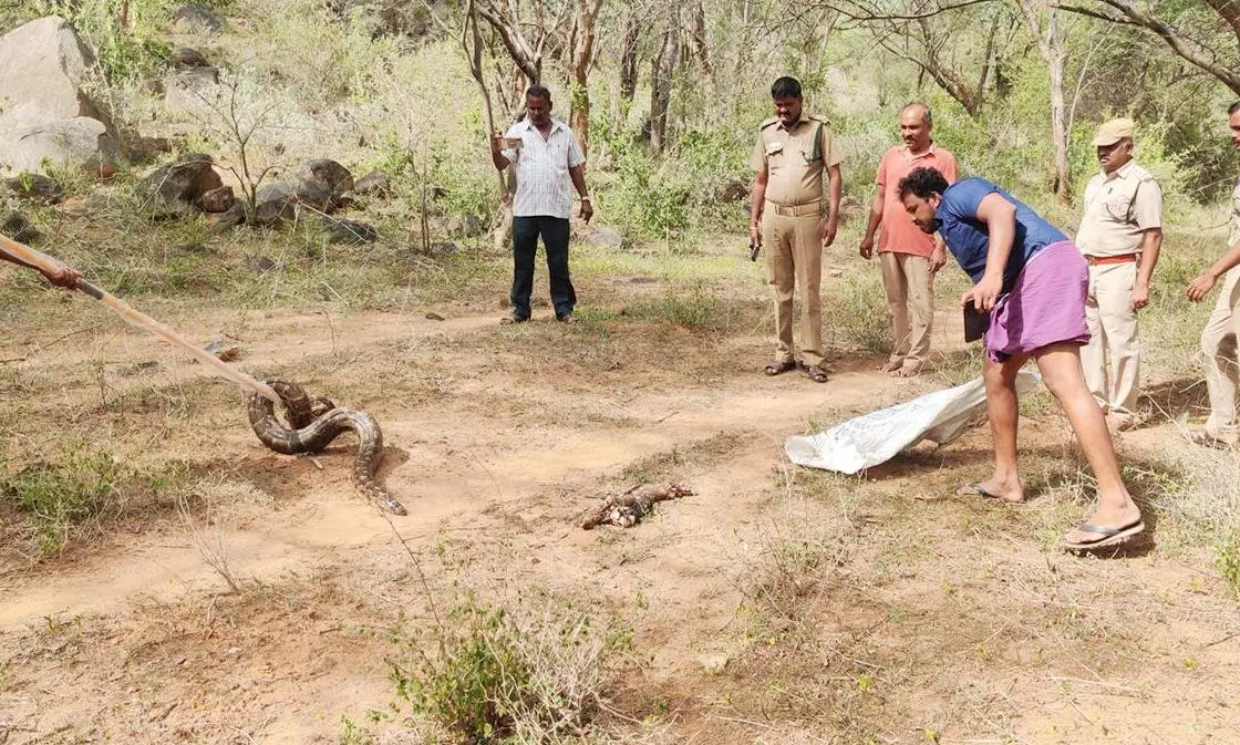 பிடித்த மலைபாம்பை வனப்பகுதியில் வனத்துறையினர் விட்ட போது எடுத்தபடம்.