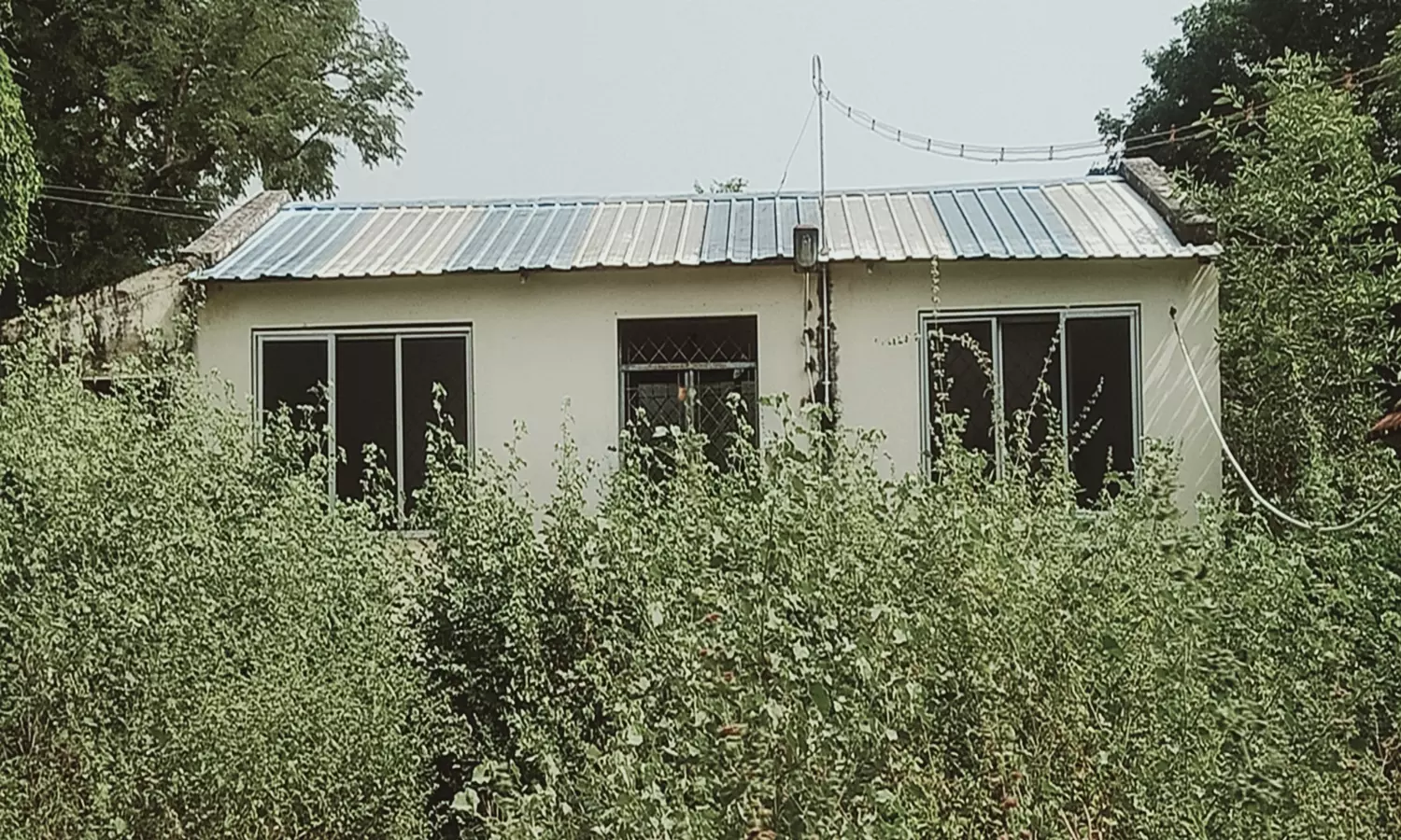 முட்புதர்களால் சூழ்ந்துள்ள பழைய ஆதார் மையத்தை படத்தில் காணலாம்.