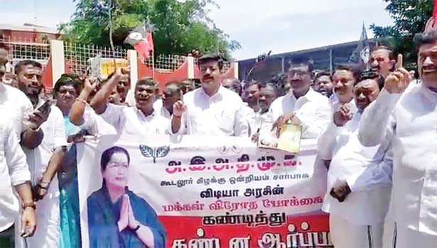 தி.மு.க. அரசை கண்டித்து கூடலூரில் அ.தி.மு.க.வினர் மாவட்ட செயலாளர் கப்பச்சிவினோத் தலைமை யில் ஆா்ப்பாட்டத்தில் ஈடுபட்டனா்.