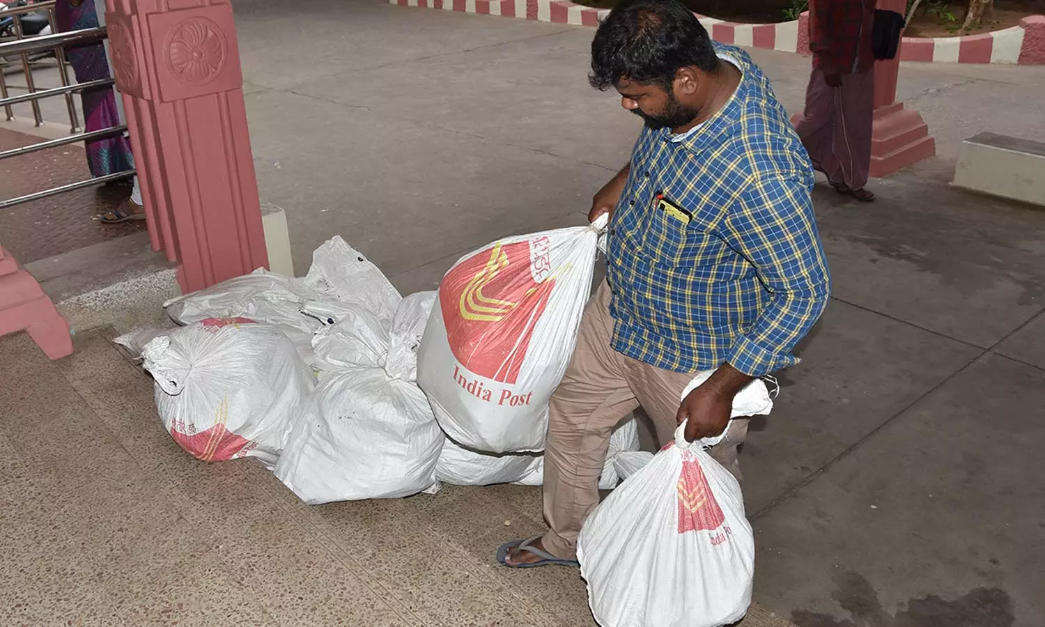 பழனி கோவில் காலிப்பணியிடங்களுக்காக வந்த விண்ணப்பங்களை மூட்டைகளில் எடுத்து செல்லும் ஊழியர்.