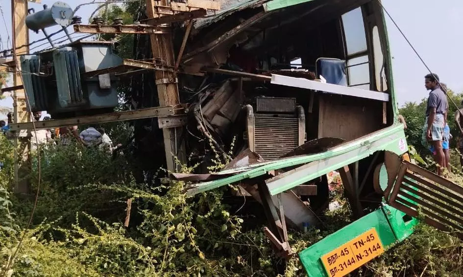 அரியலூரிலிருந்து கும்பகோணம் செல்லும் அரசு பேருந்து உடையார்பாளையம் அருகே சுந்தரேசபுரம் திருப்பத்தில் எதிர்புறம் வந்த லாரி எதிர்பாரதவிதமாக மோதியதில் அரசு பேருந்து சாலை ஓரம் பள்ளத்தில் இரங்கி மின்மாற்றியில் மோதி நின்றது.
