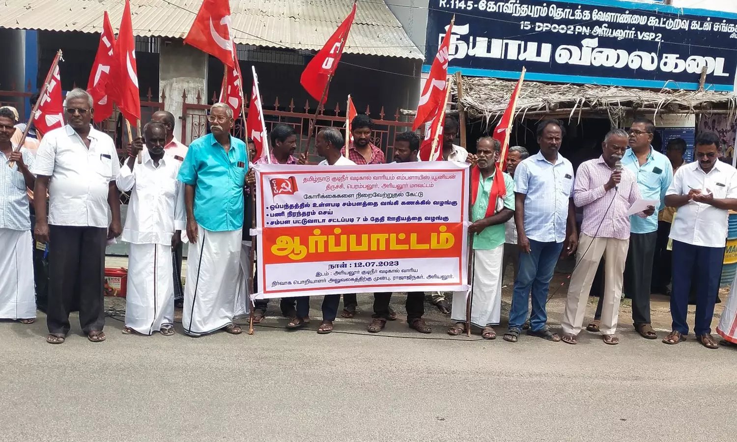 ஆர்ப்பாட்டத்துக்கு, அச்சங்கத்தின் மாவட்ட துணைத் தலைவர் எஸ்.கருணாநிதி தலைமை வகித்தார். நிர்வாகிகள் அ.ஞானசேகரன், கே.கணேசன், க.தேவேந்திரன் ஆகியோர் முன்னிலை வகித்தனர். மாநில பொதுச் செயலர் எம்.ஆத்மநாதன், திருச்சி மாவட்ட பொதுச் செயலர் ஆர்.மருதைராஜ், சிஐடியு மாவட்டச் செயலர் பி.துரைசாமி, மாவட்ட துணைத் தலைவர்கள் ஆர்.சிற்றம்பலம், எம்.சந்தானம் பங்கேற்று கோரிக்கைகளை வலியுறுத்தி பேசினர்.நிர்வாகிகள் பலர் கலந்து கொண்டு முழக்கமிட்டனர்.