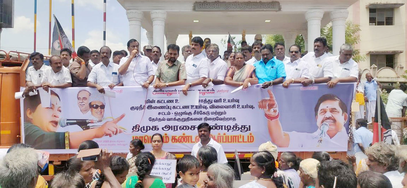 அரியலூர் பேருந்து நிலையம் எம்ஜிஆர், ஜெயலலிதா சிலைக்கு அருகே மாவட்ட அதிமுக சார்பில் மின் கட்டண உயர்வை திரும்ப பெற வலியுறுத்தியும், சொத்து வரி உயர்வை கண்டித்தும், தேர்தல் வாக்குறுதிகளை நிறைவேற்றாத திமுக அரசை கண்டித்தும், மாவட்டச் செயலாளரும் முன்னாள் அரசு கொறடாவுமான தாமரை எஸ் ராஜேந்திரன், தலைமையில் கண்டன ஆர்ப்பாட்டம் நடைபெற்றது.