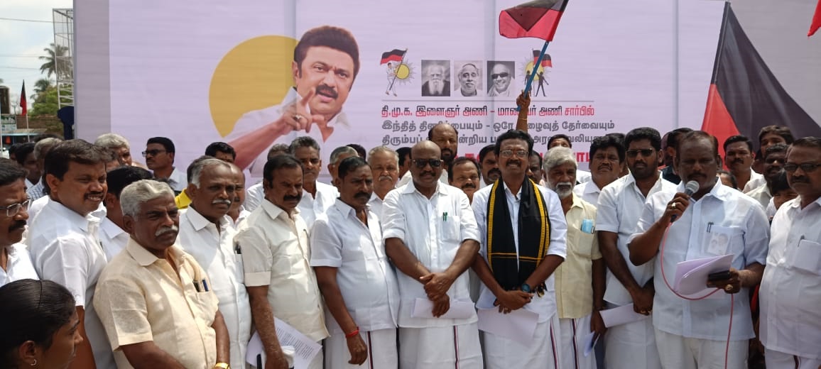 மத்திய அரசின் இந்தி திணிப்பு மற்றும் ஒரே நுழைவுத்தேர்வு முறைக்கு எதிர்ப்பு தெரிவித்து தி.மு.க. இளைஞரணி சார்பில் நேற்று தமிழகம் முழுவதும் கண்டன ஆர்ப்பாட்டங்கள் நடைபெற்றன.
