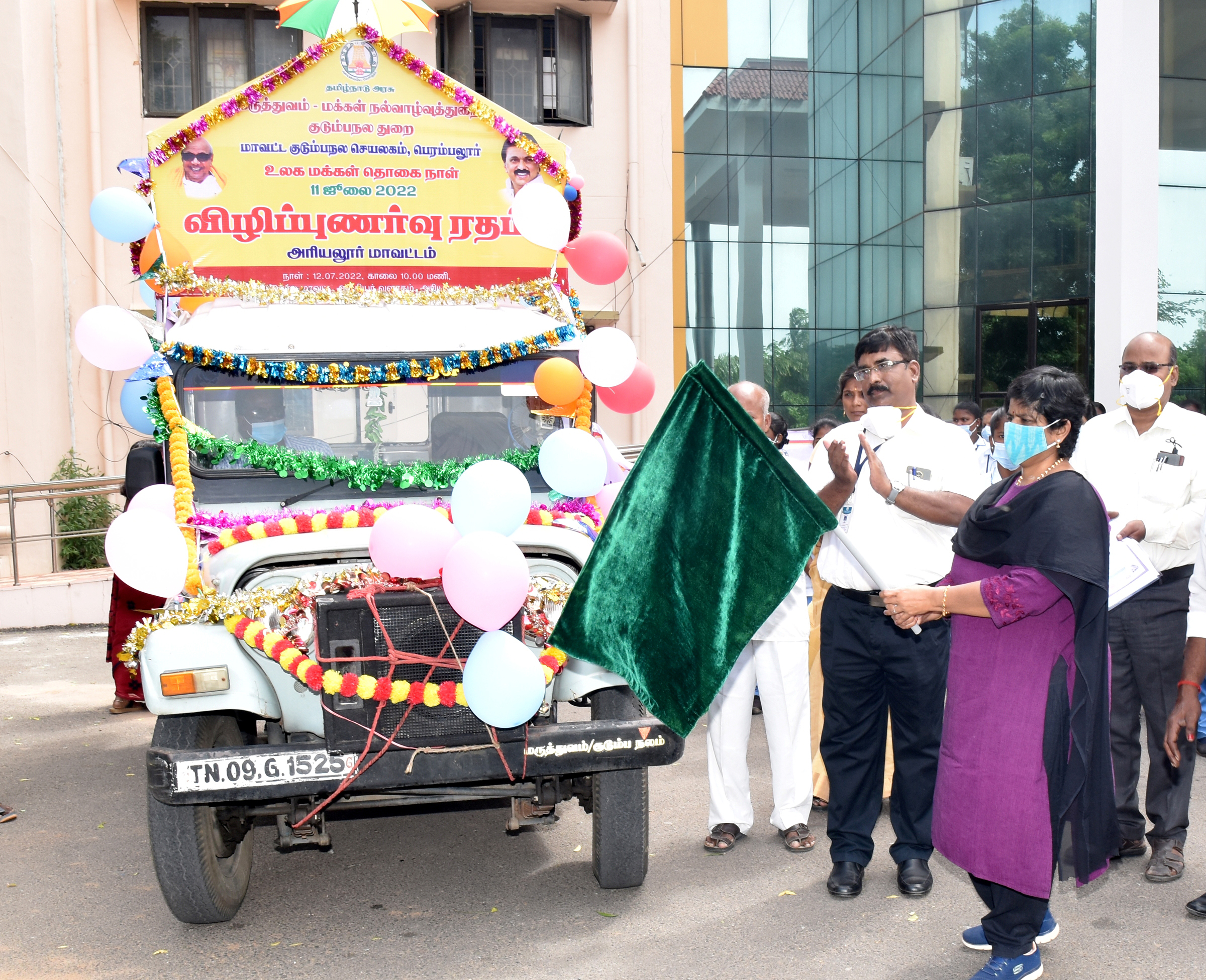 உலக மக்கள் தொகை தினத்தை முன்னிட்டு, அரியலூர் மாவட்டத்தில் விழிப்புணர்வு வாகனம் தொடக்கி வைக்கப்பட்டது. கலெக்டர் அலுவலக வளாகத்தில் நடைபெற்ற நிகழ்ச்சியில் கலந்து கொண்ட கலெக்டர் பெ.ரமணசரஸ்வதி, விழிப்புணர்வு வாகனத்தை கொடியசைத்து தொடக்கி வைத்தார்.