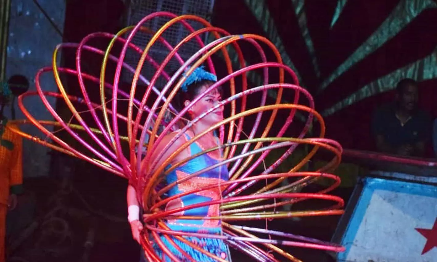 சர்க்கசில், பெண் ஒருவர் சாகசம் நிகழ்த்துவதை படத்தில் காணலாம்.