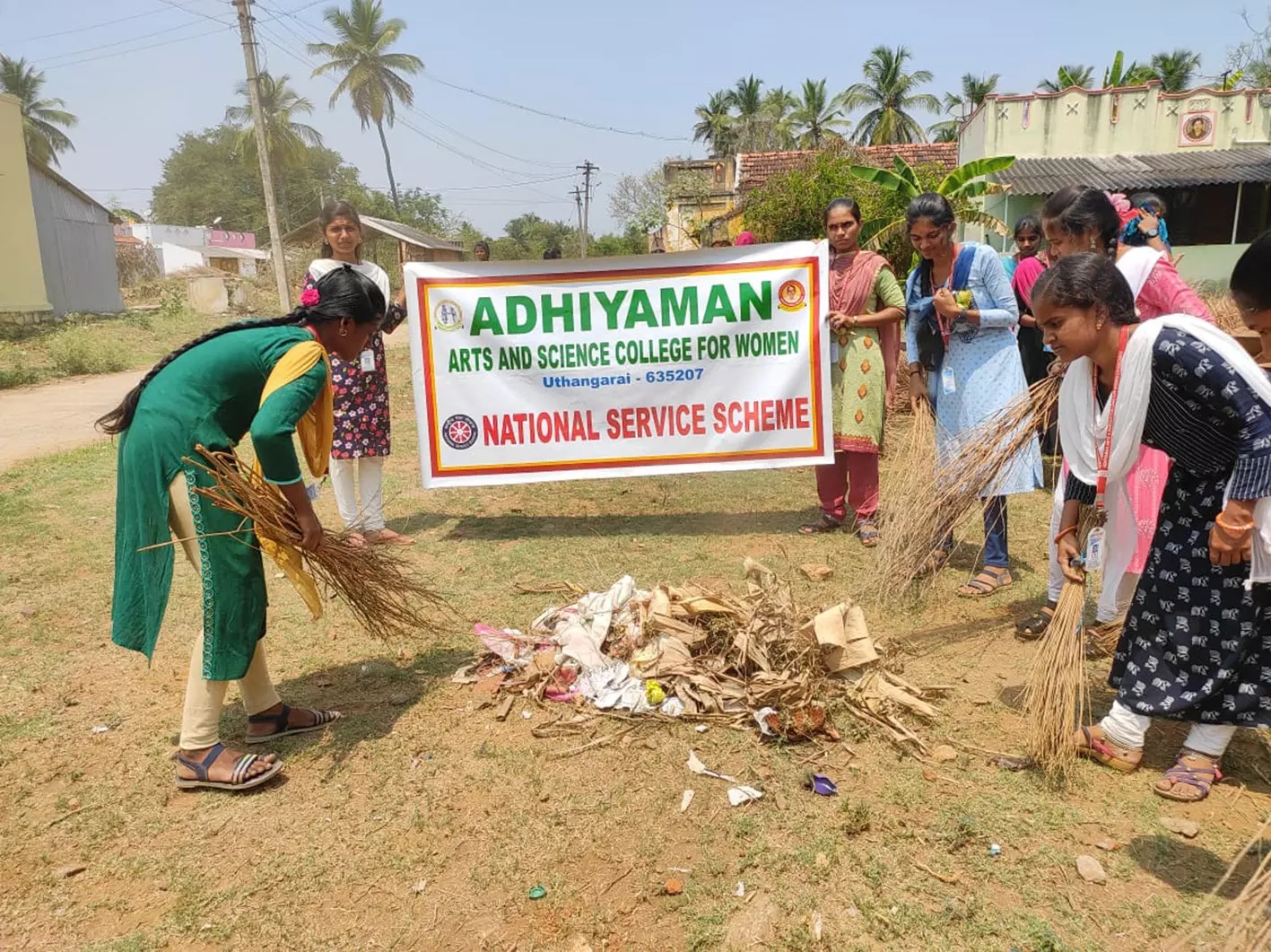 அதியமான் கல்லூரி மாணவிகள், கோணப்பட்டி கிராம சாலையோர பகுதிகளில் தூய்மை பணியை மேற்கொள்ளும் போது எடுத்த படம்.