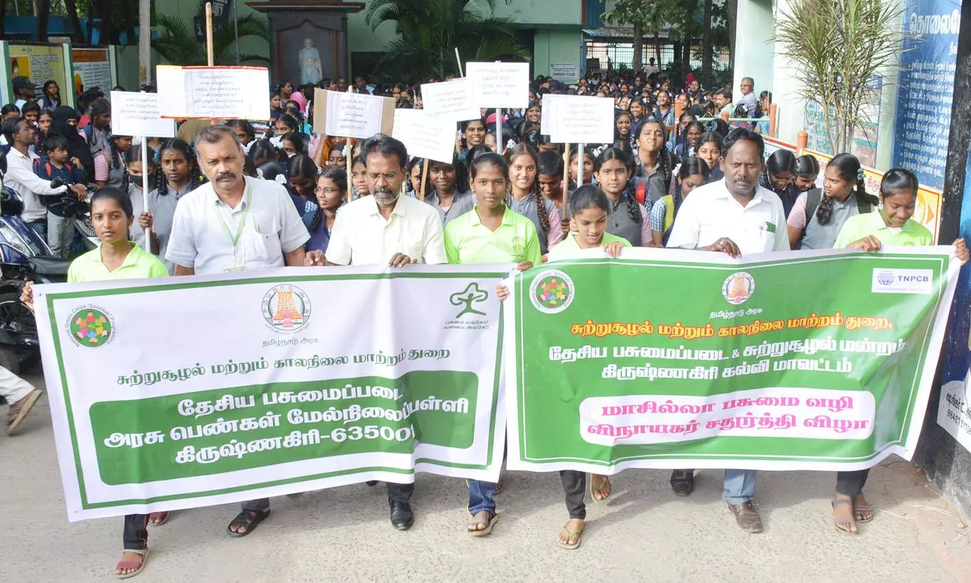 கிருஷ்ணகிரி அரசு மகளிர் மேல்நிலைப் பள்ளியில் தேசிய பசுமை படை மற்றும் சுற்றுச்சூழல் மன்றம் சார்பில் மாசில்லா பசுமை வழி, விநாயகர் சதுர்த்தி விழா கொண்டாடுவது குறித்து விழிப்புணர்வு பேரணி நடந்தது. மாவட்ட சி.இ.ஓ.,வின் நேர்முக உதவியாளர் வெங்கடேசன் தலைமை ஏற்று பேரணியை கொடியசைத்து தொடங்கி வைத்தார்.