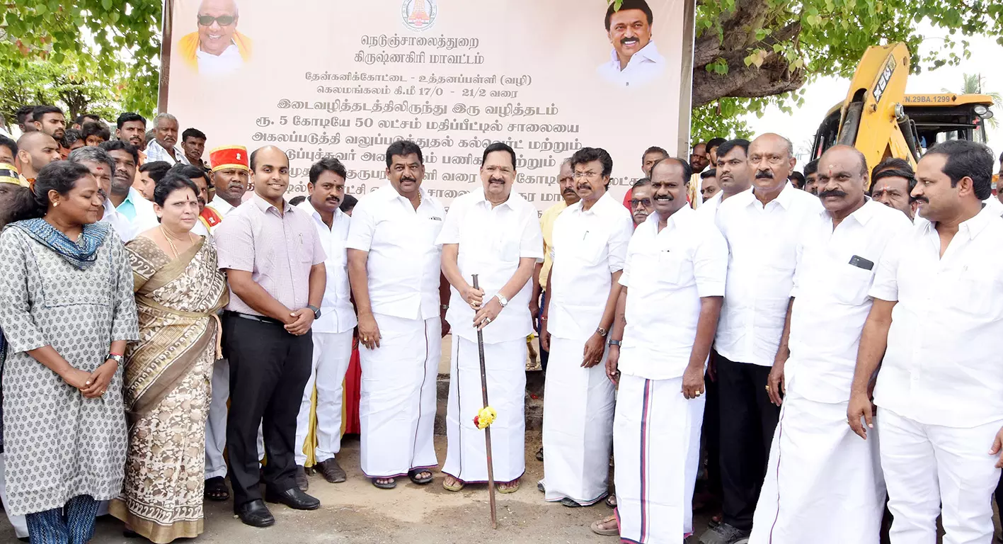 கிருஷ்ணகிரி மாவட்டம், சூளகிரி ஒன்றியம் பாத்த கோட்டாவில், தேன்கனிக்கோட்டை முதல் உத்தனப்பள்ளி வரை ரூ.5 கோடியே 50 லட்சம் மதிப்பில் சாலை அகலப்படுத்தி வலு ப்படுத்தும் பணிகளுக்கும், பாத்தகோட்டா முதல் டி. குருபரபள்ளி வரை ரூ. 2 கோடியே 55 லட்சம் மதிப்பீட்டில் ஊராட்சி ஒன்றிய சாலையை மாவட்ட சாலையாக தரம் உயர்த்தும் பணிகளுக்கும் என மொத்தம் ரூ.22 கோடியே 79 லட்சம் மதிப்பிலான கட்டிடப்பணிகளுக்கு பூமிபூஜை செய்து பணிகளை தொங்கி வைத்தும், ஓசூர் மாநகராட்சிக்குட்பட்ட காந்திநகர், கிருஷ்ணா நகர், டைட்டான் டவுன்சிப் மற்றும் ஓ.காரப்பள்ளி கொத்தகொண்டபள்ளி ஆகிய 5 பகுதியில் பகுதி நேர மற்றும் முழுநேர ரேஷன் கடைகளையும், கைத்தறி மற்றும் துணிநூல் துறை அமைச்சர் ஆர்.காந்தி நேற்று திறந்து வைத்தார்.