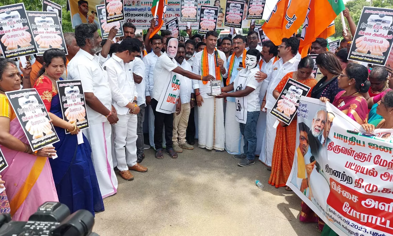 திருவள்ளூர் அரசு மருத்துவக் கல்லூரி அருகே பா.ஜ.க பட்டியல் அணி சார்பில் திருவள்ளூர் அரசு மருத்துவக் கல்லூரி அருகே திமுக அரசுக்கு பிச்சை அளிக்கும் போராட்டம் நடைபெற்றது