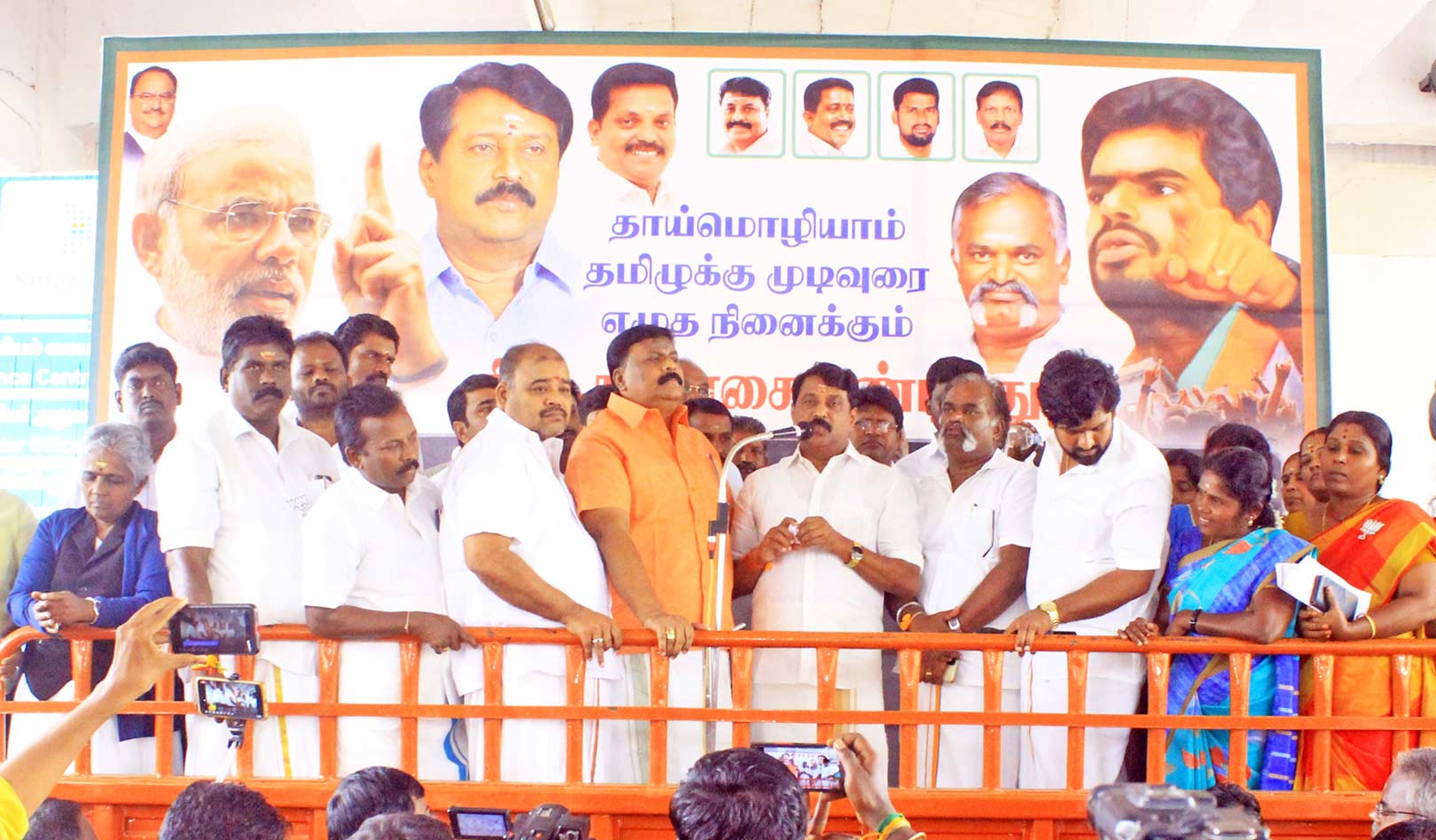 தமிழக அரசு தமிழ் மொழியின் வளர்ச்சிக்கு முக்கியத்துவம் அளிக்கவில்லை என்று கூறி தமிழக பா.ஜ.க. சார்பில் இன்று தமிழகத்தில் 60 இடங்களில் ஆர்ப்பாட்டம் நடைபெற்றது.