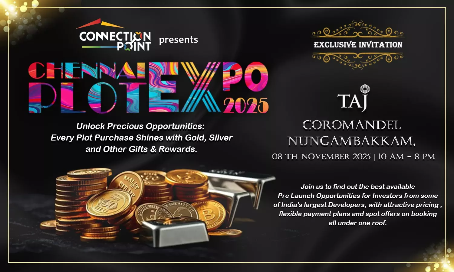 புதிய விமானநிலையம், புறவழி சாலைகள், தொழிற்சாலை விரிவாக்கங்கள் ஆகியவை நில சந்தைக்கு புதிய உயிர் ஊட்டுகின்றன. இதை முன்னிட்டு Connection Point நிறுவனம் நடத்தும் சென்னை ப்ளாட் எக்ஸ்போ 2025 வரும் நவம்பர் 8, சனிக்கிழமை, தாஜ் கொரோமண்டல், நுங்கம்பாக்கம் இல் நடைபெற உள்ளது.