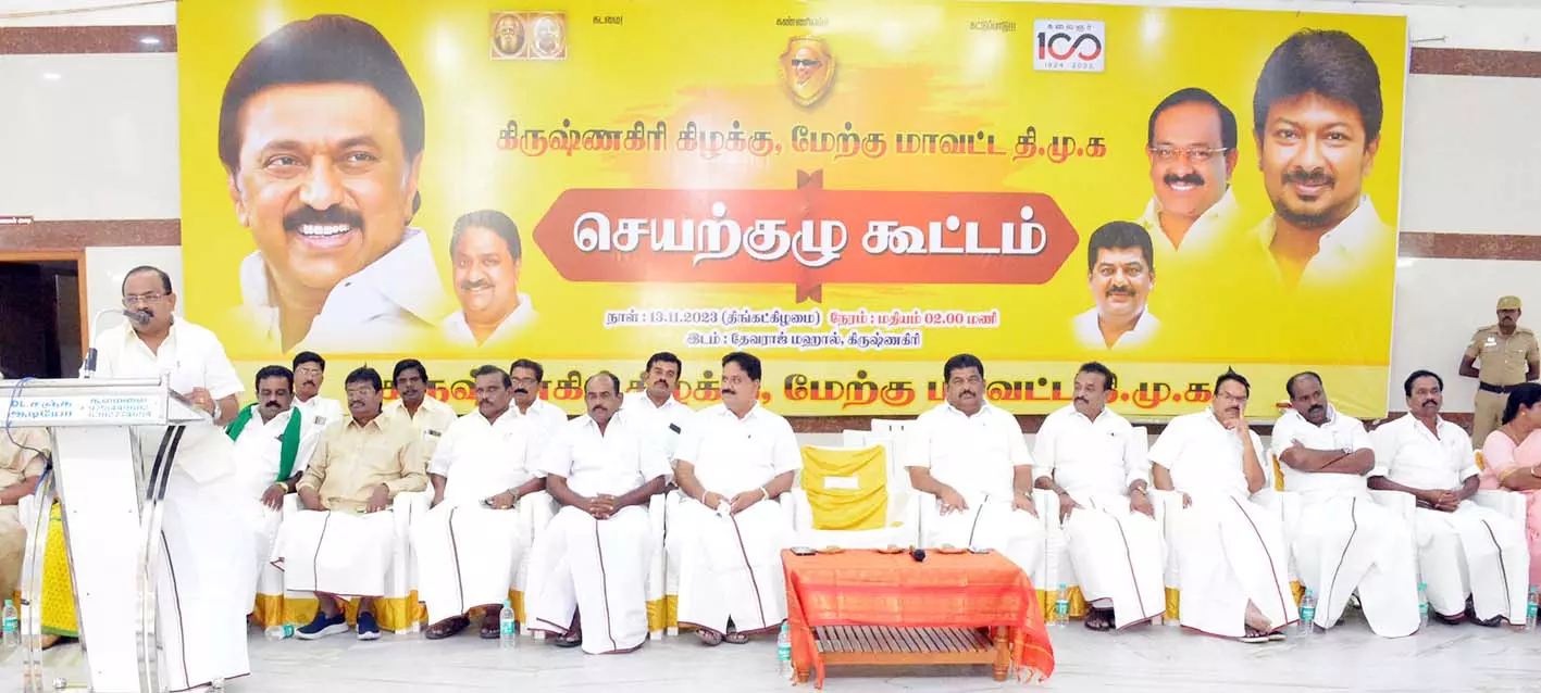 கிருஷ்ணகிரி கிழக்கு, மேற்கு மாவட்ட தி.மு.க. செயற்குழு கூட்டம் கிருஷ்ணகிரி தேவராஜ் மகாலில் நேற்று மாலை நடைபெற்றது. கூட்டத்திற்கு கிருஷ்ண–கிரி கிழக்கு மாவட்ட தி.மு.க. செயலாளர் டி.மதியழகன் எம்.எல்.ஏ., மேற்கு மாவட்ட செயலாளர் ஒய்.பிரகாஷ் எம்.எல்.ஏ. ஆகியோர் தலைமை தாங்கினார்கள்.