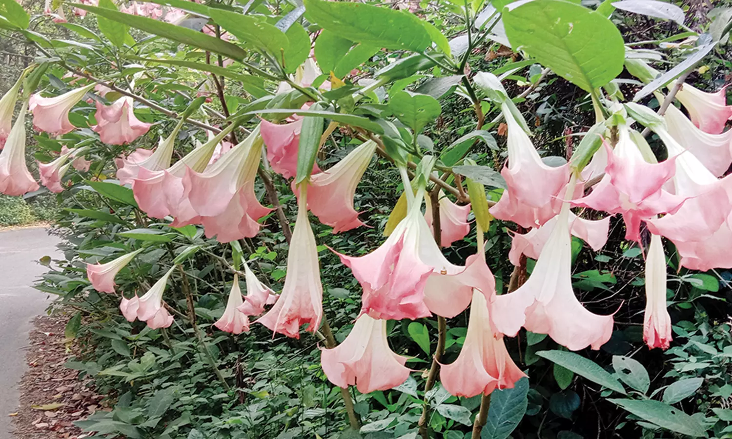 இந்த சங்கு பூ செடிகளில் அதிக அளவு பூக்கள் பூத்து குலுங்குகின்றன. இப்பகுதிகளில் சாலை ஓரங்களில் பல்புகள் தொங்க விட்டது போல் ரோஸ், மஞ்சள், வெள்ளை போன்ற நிறங்களில் சங்கு பூக்கள் பூத்து காணப்படு கிறது. இந்த பூ காலையில் மலர்ந்து மாலையில் உதிர்கிறது. இந்தப்பூக்களை வாகனத்தில் செல்பவர்கள் ஆச்சரியத்துடன் கண்டு ரசிப்பதுடன், புகைப்படமும் எடுத்து மகிழ்கின்றனர்.