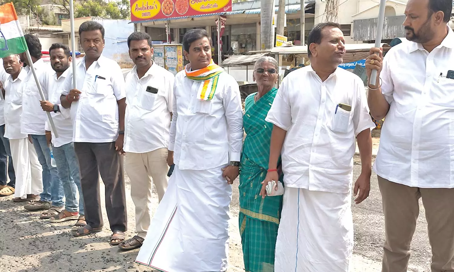 தெற்கு மாவட்ட காங்கிரஸ் தலைவர் மக்கள் ராஜன் மனித சங்கிலி மற்றும் ஆர்ப்பாட்டத்திற்கு தலைமை தாங்கினார். இதில் 50-க்கும் மேற்பட்ட நிர்வாகிகள் கலந்து கொண்டு சாலையில் இரு கைகளையும் கோர்த்து நின்றபடி மனித சங்கிலி போராட்டத்தில் ஈடுபட்டனர்.