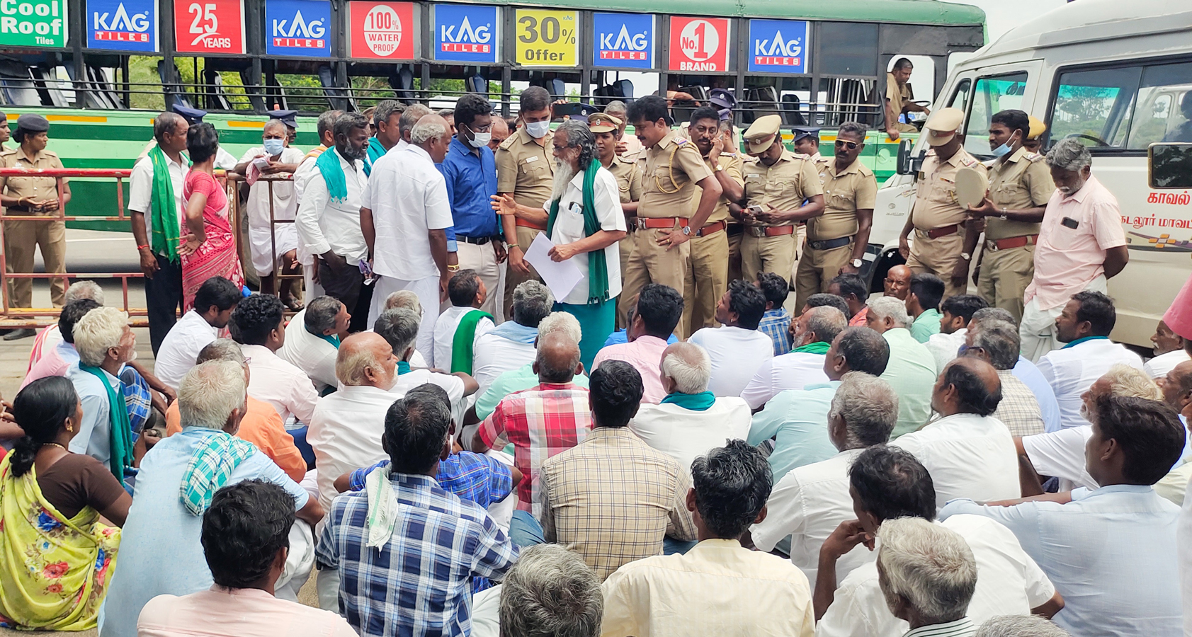 ஆகையால் இன்று மறியல் போராட்டம் அறிவித்து தற்போது மறியல் போராட்டம் நடைபெற்று வருகின்றது. ஆனால் இதற்கு நிரந்தர தீர்வு கிடைக்கவில்லை என்றால் தேசிய நெடுஞ்சாலையில் 5 ஆயிரத்துக்கும் மேற்பட்ட விவசாயிகளை ஆடு, மாடுகளை திரட்டி மிகப்பெரிய அளவில் போராட்டம் விரைவில் நடத்தப்பட உள்ளோம். மேலும் தமிழக முதலமைச்சர் மு.க. ஸ்டாலின் நெல் டன் ஒன்றுக்கு 2500 ரூபாயும், கரும்புக்கு 4000 ரூபாயும் வழங்கப்படுவதாக உறுதி அளித்தார். அவர் வழங்குவார் என நம்பிக்கை வைத்துள்ளோம். மேலும் கூட்டுறவு கடன் சங்கத்தில் ஒரு ஏக்கர் நெல் பயிரிடுவதற்கு 32,000 கடன் வழங்க வேண்டும். ஆனால் பத்தாயிரம் ரூபாய் மட்டுமே வழங்குகிறார்கள். மேலும் நேரடி கொள்முதல் நிலையத்தில் லஞ்சம் தலைவிரித்து ஆடுவதால் விவசாயிகள் மிகவும் பாதிப்புக்கு உள்ளாகி உள்ளனர். ஆகையால் இதற்கெல்லாம் தீர்வு காண இந்த போராட்டம் நடைபெற்று உள்ளது இவ்வாறு கூறினார். இதனை தொடர்ந்து போலீசார் போராட்டத்தில் ஈடுபட்டவர்களிடம் தொடர்ந்து பேச்சு வார்த்தையில் ஈடுபட்டனர். அப்போது அவர்கள் கலெக்டரை சந்தித்து எங்கள் கோரிக்கைகள் தொடர்பாக பேச வேண்டும் என திட்டவட்டமாக தெரிவித்தனர். இதனை தொடர்ந்து முக்கிய நிர்வாகிகள் கலெக்டரை சந்தித்து மனு அளிக்க போலீசார் அனுப்பி வைத்தனர். இதனை தொடர்ந்து போராட்டத்தில் ஈடுபட்டவர்கள் அங்கு இருந்து வருவதால் பரபரப்பாக காணப்பட்டு வருகிறது.