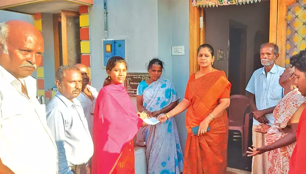 காசோலையை, நகர மன்ற தலைவி நிர்மலா பப்பிதா மணிகண்டன் வழங்கிய காட்சி.